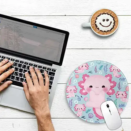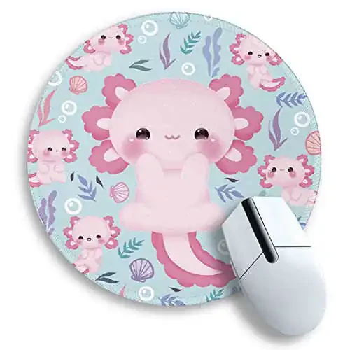 Novelty Mouse Pad: This small mouse pad is designed with cute axolotls animals print arts. The cute and funny mousepad will always bring more happiness and fun to your life. You will get tons of comments on it Great Size: Diameter is 8.66 inches, thickness is 0.12 inches. It is one small round mouse pad, lightweight and easy to carry, soft and foldable, great for home, office, game or travel Super-smooth Surface: The surface of mousepad is made of premium-textured and high-quality Lycra cloth, super smoothly, which can ensure smoother mouse control and pinpoint accuracy. Optimized for mouse sensor, designed for maximum control and precision. Suitable for all kinds of mouse, laser and optical Quality and Comfortable: Made of quality natural rubber, comfortable and heat resistant. With edges stitched and anti-slip base, fit for all types of surfaces, including glass, wood, metal, wood, etc Amazing gift: Patterns printed vividly, never to fade, with creative arts design, great gifts for Christmas, Thanksgiving, Valentine's Day, Mother`s Day, Father`s Day, Easter, birthday teacher appreciation week, special holidays. Makes a great gift for women, girls, teachers, family, friends, coworkers, and bosses