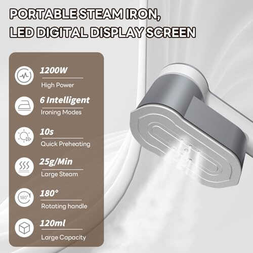 【6 ADJUSTABLE MODES】The Steam Iron has 6 ironing modes to meet different fabric types and ironing needs. You can use the buttons to switch between the different vapor levels and the LED display will show the fabric type for each level, allowing you to iron all fabrics with ease. 【POWERFUL FUNCTIONS】Our clothes steamer has 1200W high power and 10 seconds heating function to quickly deal with the wrinkles on your clothes, strong steam dry steam does not wet clothes, directly reaching the depths of fibers, quickly softening fibers smooth out deep folds, which improves the overall ironing efficiency and instantly restores your clothes to like-new condition. 【PORTABLE & COMFORTABLE】This portable steamer comes with a 180° rotating head (0°-90°-180°), easy rotatable, perfect for both vertical and flat ironing. Portable steamer iron fits in your suitcase or backpack without too much space, making it easy to carry around and perfect for vacations, travel, and home. 【120ML WATER TANK】The clothes steamer comes with a 120ml large water tank which allows you to iron multiple loads of clothes at a time , and adopt transparent design allows you can check the water level at any time. We recommend using demineralized or distilled water for optimal performance. 【WARM REMINDER】Our steamer for clothes is Ideal for use in countries like the US, Canada, Mexico, and Japan. Note: Not suitable for 220-240V outlets to prevent damage.
