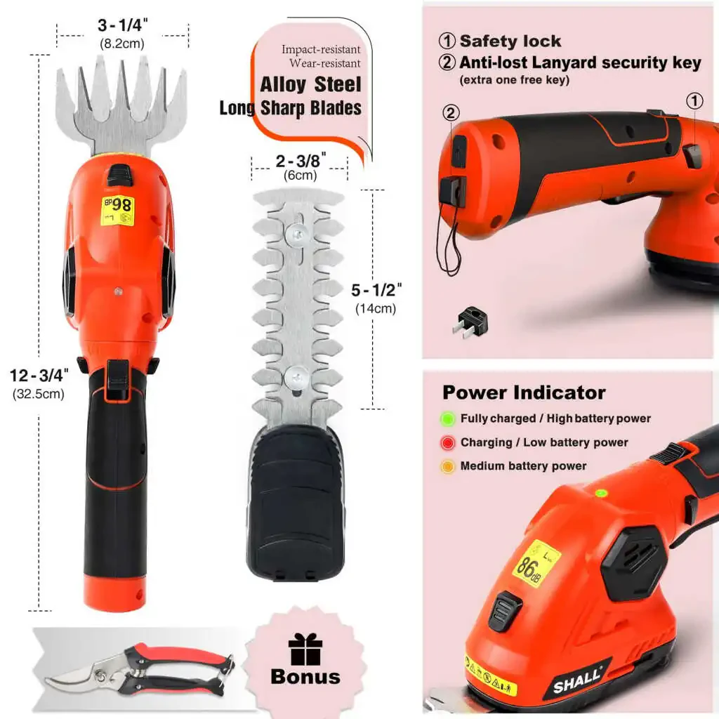 SHALL Akülü Çit Budama Makası ve Bahçe Makası, bahçe işlerinizi kolaylaştırmak ve daha keyifli hale getirmek için tasarlanmış çok yönlü bir araçtır. 7.2V güçlü bataryası sayesinde kablolara bağımlı kalmadan özgürce hareket edebilir, çitlerinizi, çalılarınızı ve otlarınızı rahatlıkla budayabilirsiniz. Bu 2'si 1 arada tasarım, hem çit budama makası hem de ot biçme makası olarak kullanılabilme özelliği sunarak, bahçenizdeki farklı ihtiyaçlara tek bir çözüm getirir. Ergonomik tasarımı ve hafif yapısı sayesinde uzun süreli kullanımlarda bile yorgunluğu en aza indirir. Keskin bıçakları, temiz ve düzgün kesimler sağlayarak bitkilerinizin sağlıklı gelişimine katkıda bulunur. SHALL Akülü Çit Budama Makası, bahçenizi düzenli ve bakımlı tutmak için ideal bir yardımcıdır. Kompakt yapısı sayesinde kolayca saklanabilir ve taşınabilir, böylece her zaman elinizin altında olur. Güvenli kullanım için tasarlanmış olan bu ürün, hem amatör hem de profesyonel bahçıvanlar için mükemmel bir seçimdir. Bahçenizdeki bitki örtüsünü şekillendirmek, düzenlemek ve sağlıklı tutmak artık çok daha kolay ve keyifli! SHALL Akülü Çit Budama Makası, bahçenize estetik bir görünüm kazandırmanın yanı sıra bitkilerinizin daha iyi hava almasını ve güneş ışığından faydalanmasını sağlayarak onların sağlıklı büyümesine yardımcı olur. Bu ürün, bahçenizi güzelleştirmek ve bakımını kolaylaştırmak için ihtiyacınız olan her şeyi sunar. Kablosuz kullanım özgürlüğü, hafif tasarımı ve çok yönlü özellikleriyle SHALL Akülü Çit Budama Makası, bahçe işlerinizde vazgeçilmez bir araç olacaktır. Artık bahçe bakımı zahmetli bir iş olmaktan çıkacak, keyifli bir hobiye dönüşecektir. SHALL ile bahçenizdeki potansiyeli keşfedin ve onu hayallerinizdeki gibi düzenleyin!
