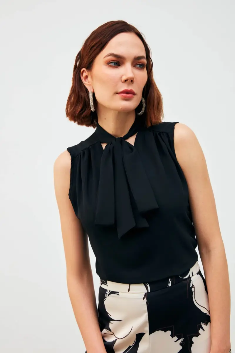 Yumshoq va nafas oladigan matodan tikilgan bu bluzka kun bo'yi qulay foydalanishni ta'minlaydi. Qora rangi bilan har qanday kombinatsiyangizga mos keladigan Sharfli Yengsiz Bluzka, kundalik foydalanishda, maxsus tadbirlarda va ish hayotida tanlashingiz mumkin bo'lgan zamonaviy tanlovdir.