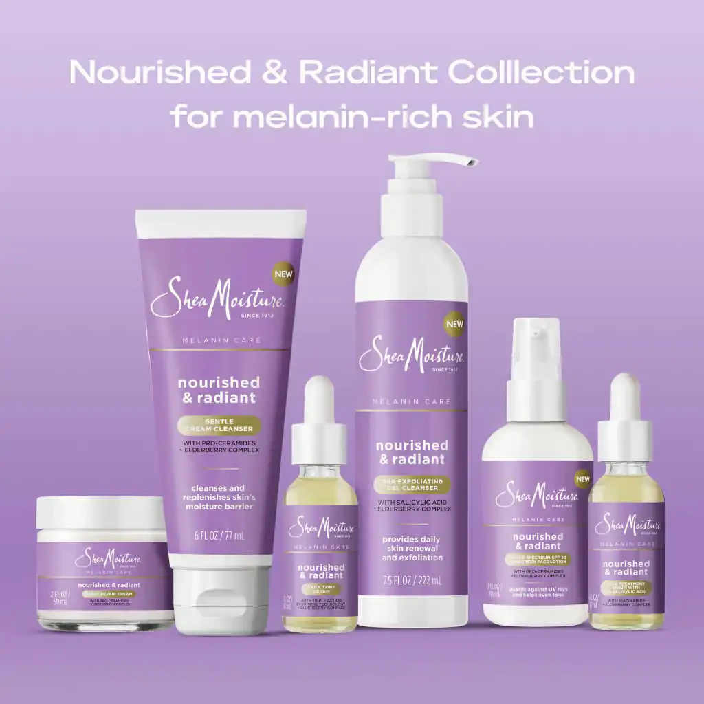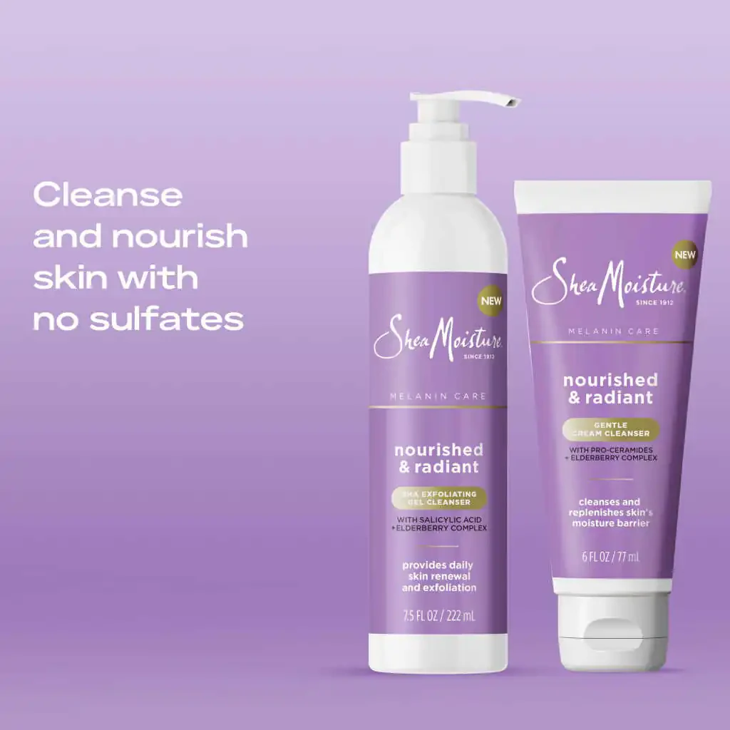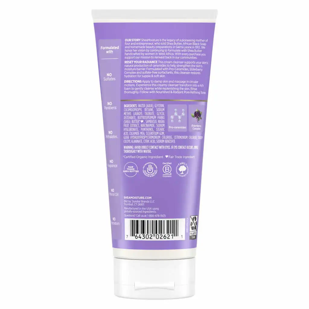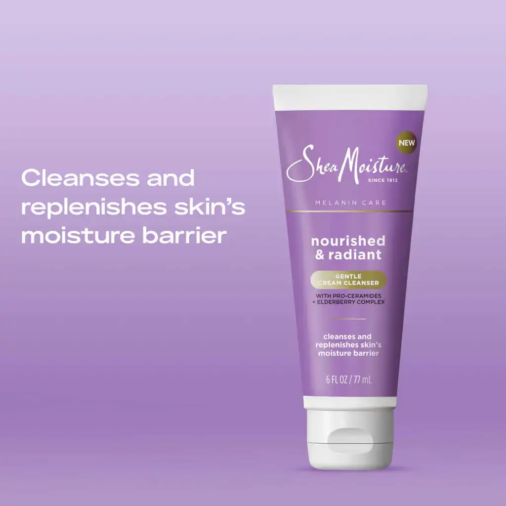 Discover the secret to a refreshed and radiant complexion with SheaMoisture Melanin Care Cream Cleanser. Designed for sensitive skin, this luxurious skin cleanser is infused with Pro-Ceramides and sulfate-free surfactants. It cleanses the skin while restoring essential hydration, leaving it feeling supple and irresistibly soft. Our innovative cleanser moisturizes skin, restoring smoothness and enhances its natural radiance. Our gentle formula is enriched with Pro-Ceramides. This crucial process helps strengthen the skin’s moisture barrier, ensuring long-lasting hydration for healthy-looking skin. Infused with an Elderberry Complex, our cleanser promotes a healthier, brighter complexion with every wash. Our gentle cleansing cream is 100% free of parabens, phthalates, petrolatum, mineral oil, and fragrance.