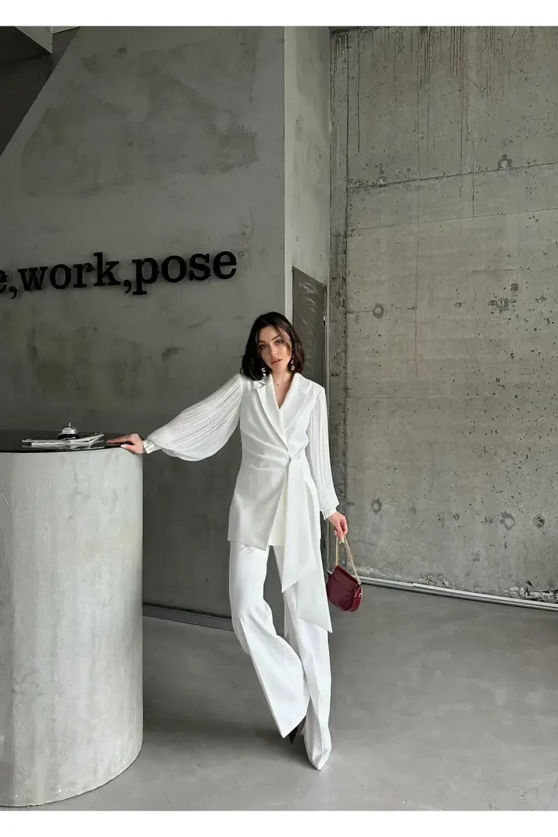 shifon yengli kostyum, ikki jinsli kostyum, ayollar kostyumi, zamonaviy kostyum, maxsus tadbir, kokteyl kechasi, kundalik kiyim, ish suhbatlari, rasmiy uchrashuvlar