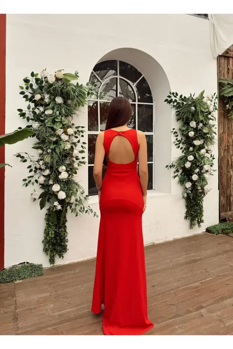 Qizil yirtqichli kechki libos | V bo'yinli chiroyli kechki ko'ylak | Shimoliy yoqali kechki libos