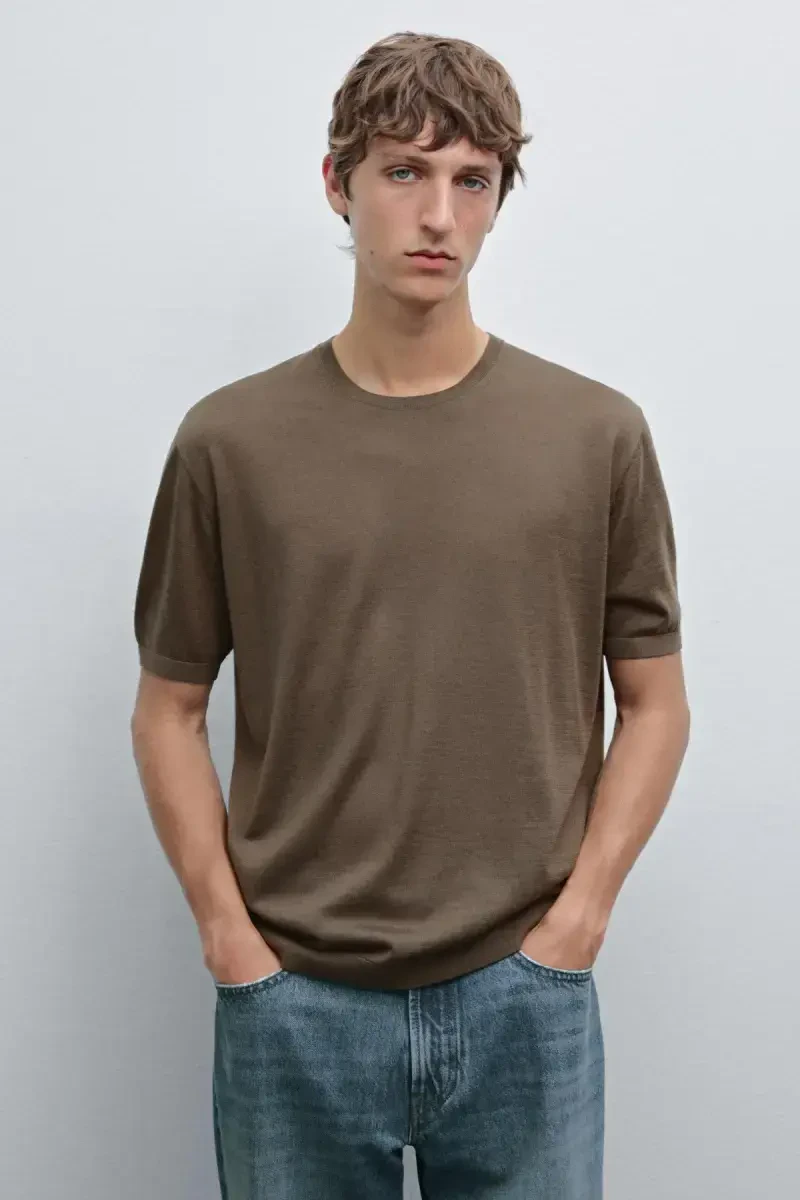 Wool Knit T-Shirt - Short Sleeve Khaki Color | Stylish and Comfortable
