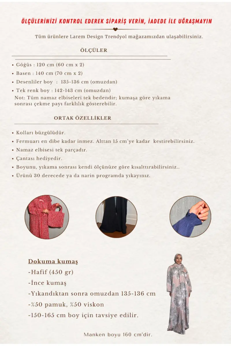 Sifatli tikishlari va mustahkam mato tuzilishi tufayli, ushbu namoz libosi uzoq muddat foydalanish uchun juda mos keladi. Uni tozalash oson va dazmollashni talab qilmaydi.