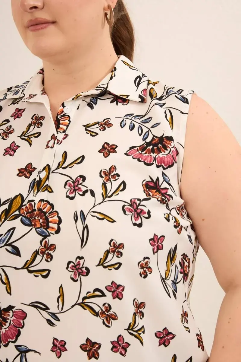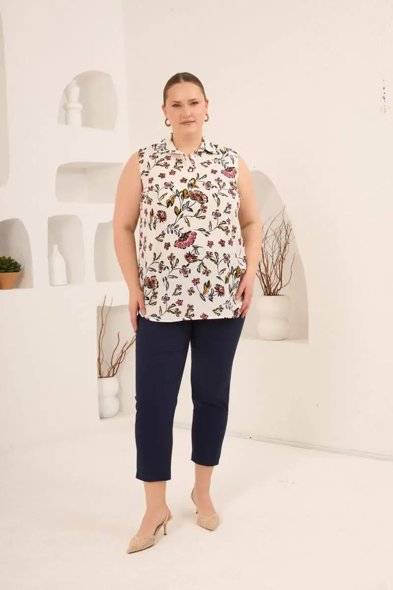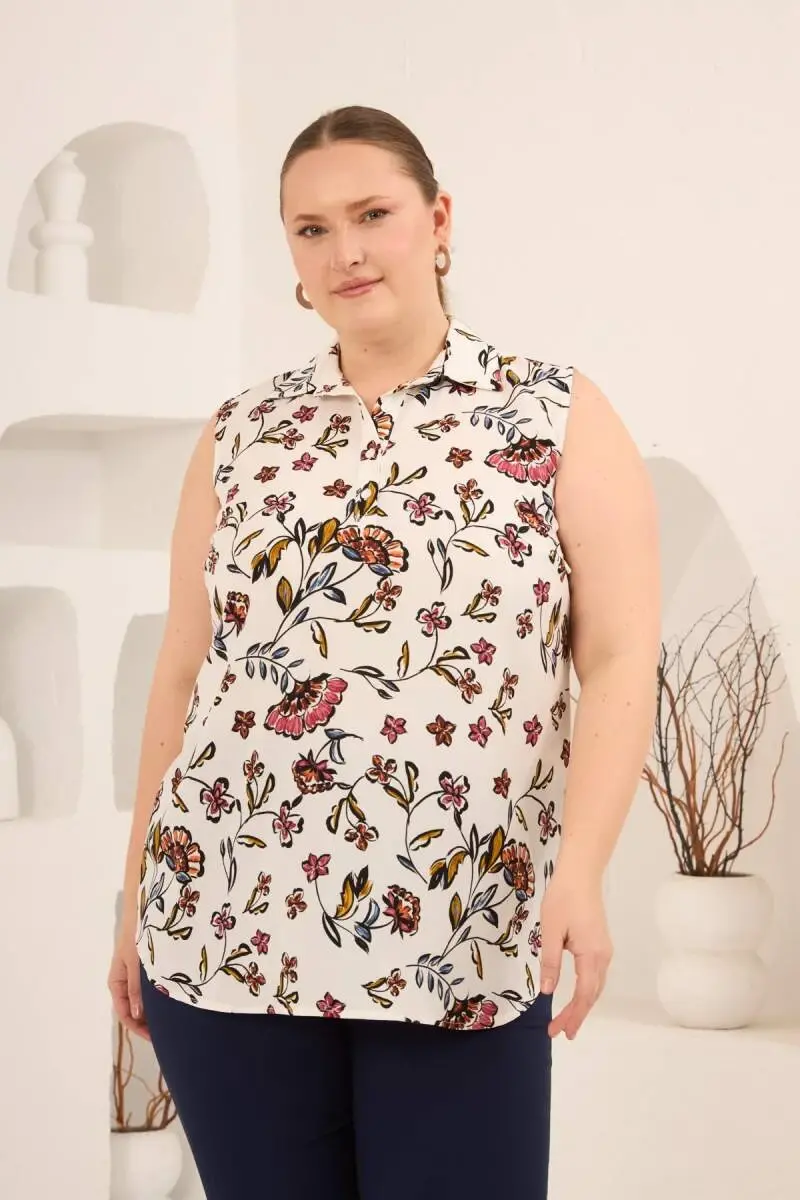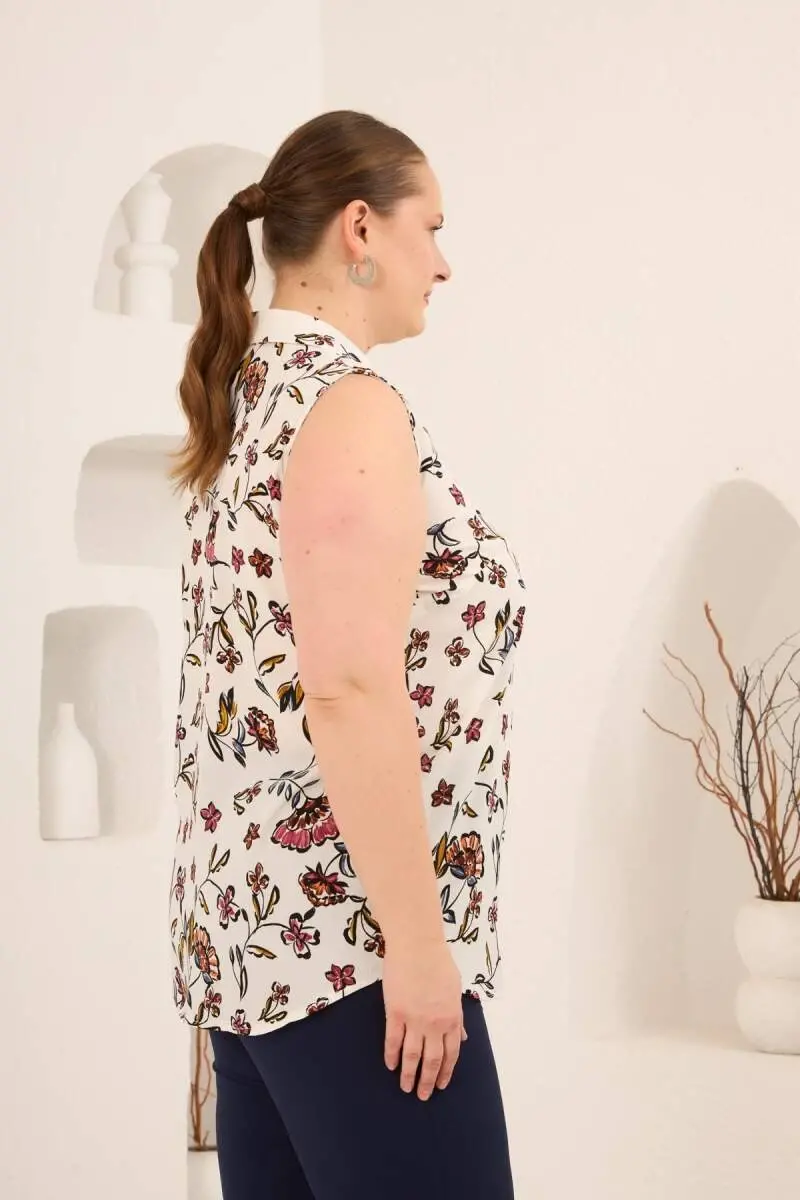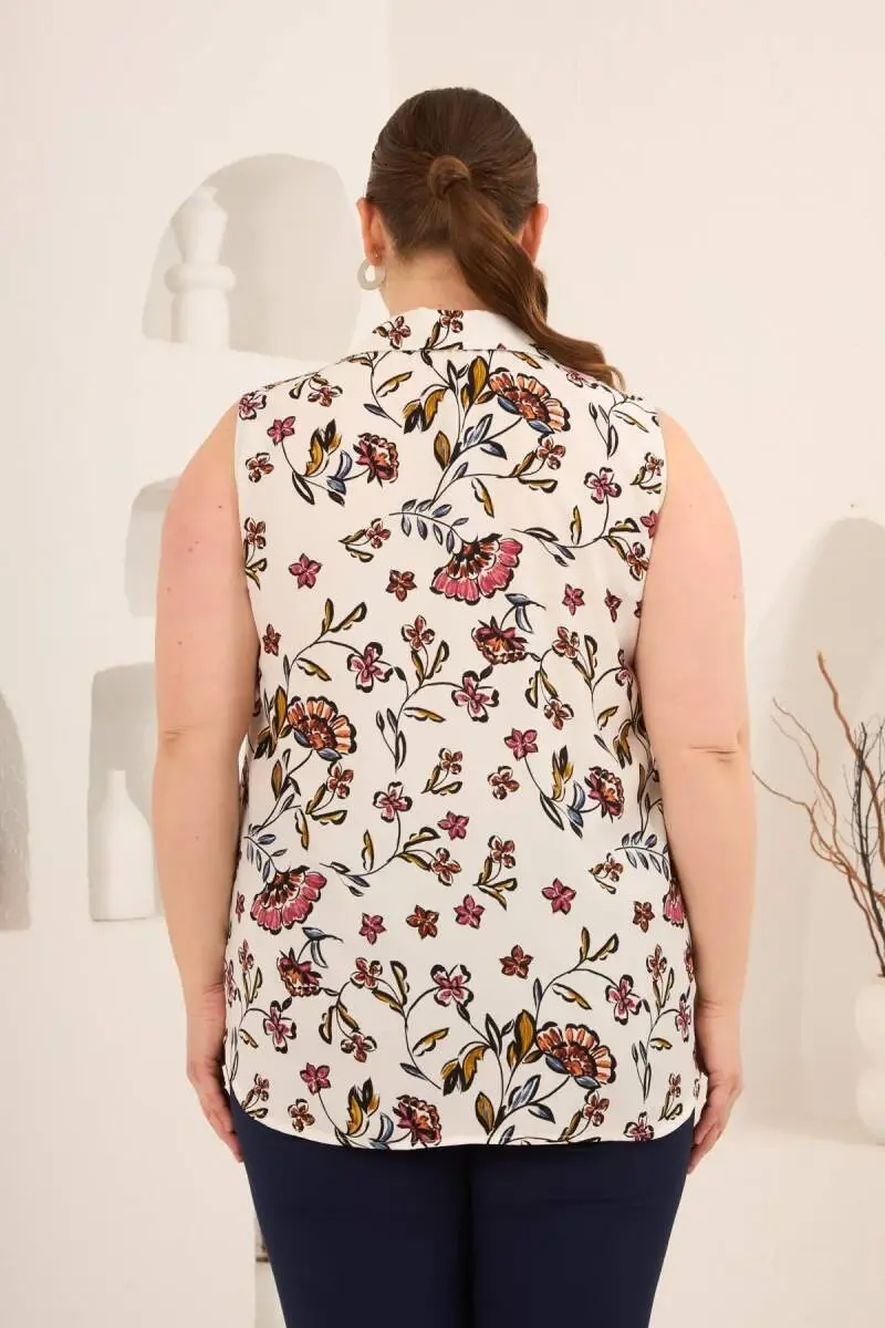 Sıfır Kol Desenli Büyük Beden Bluz Ekru