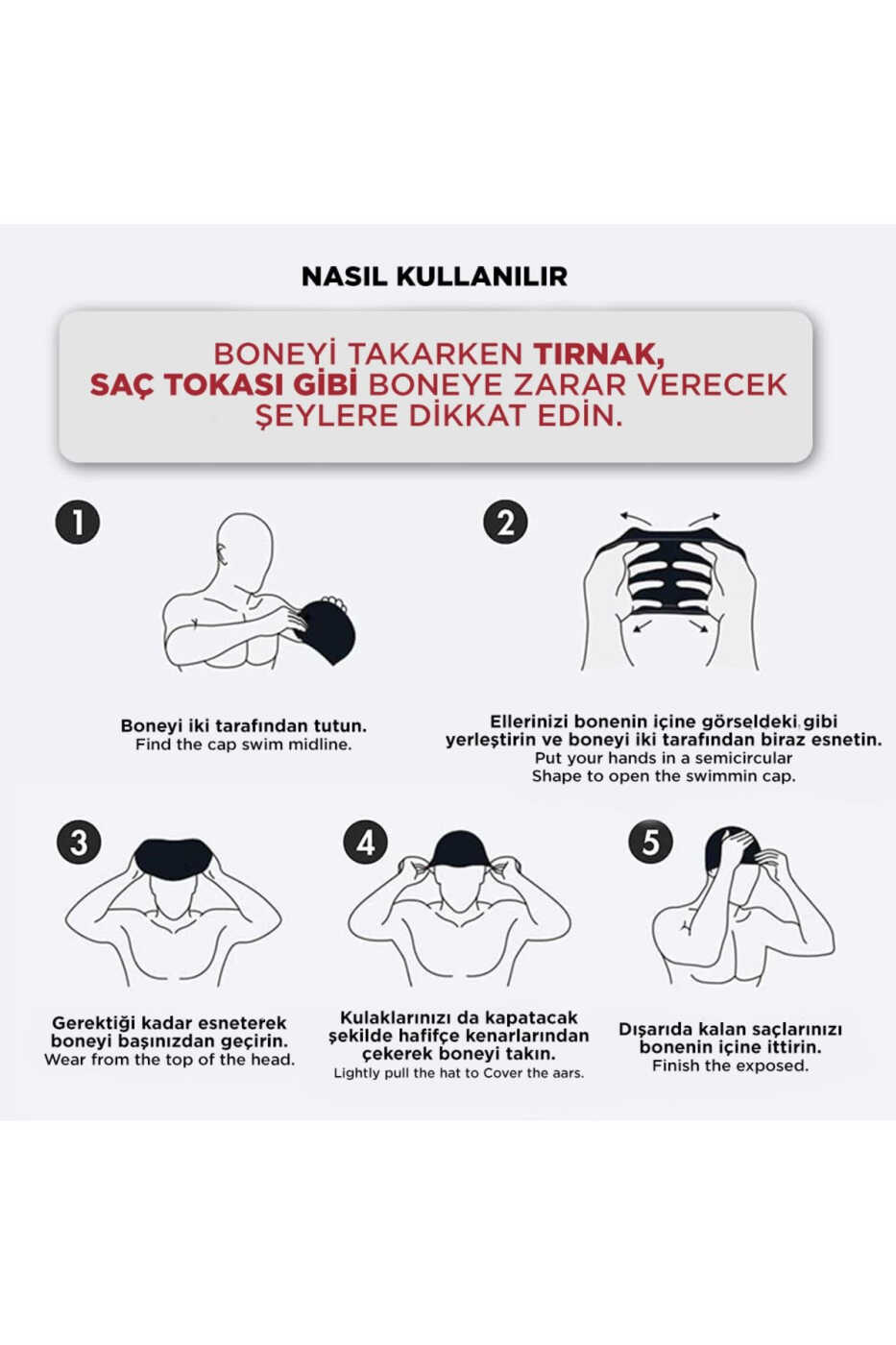 It is recommended to dampen your hair slightly before putting on the cap. After putting the cap on your head, make sure all your hair is inside the cap. Be careful not to pull your hair while putting on the cap.
