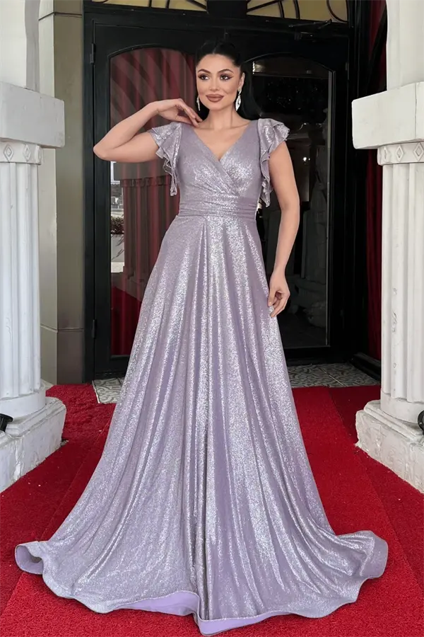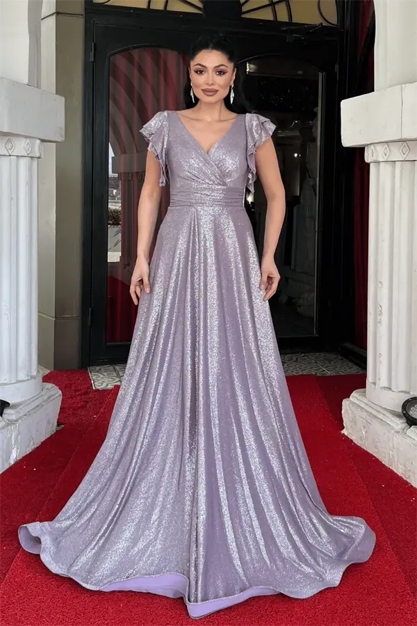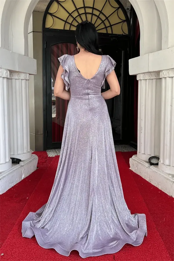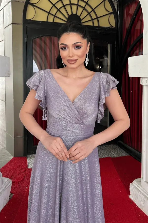 Simli Krep Kumaş Omuz Volanlı Abiye Elbise - LİLA
