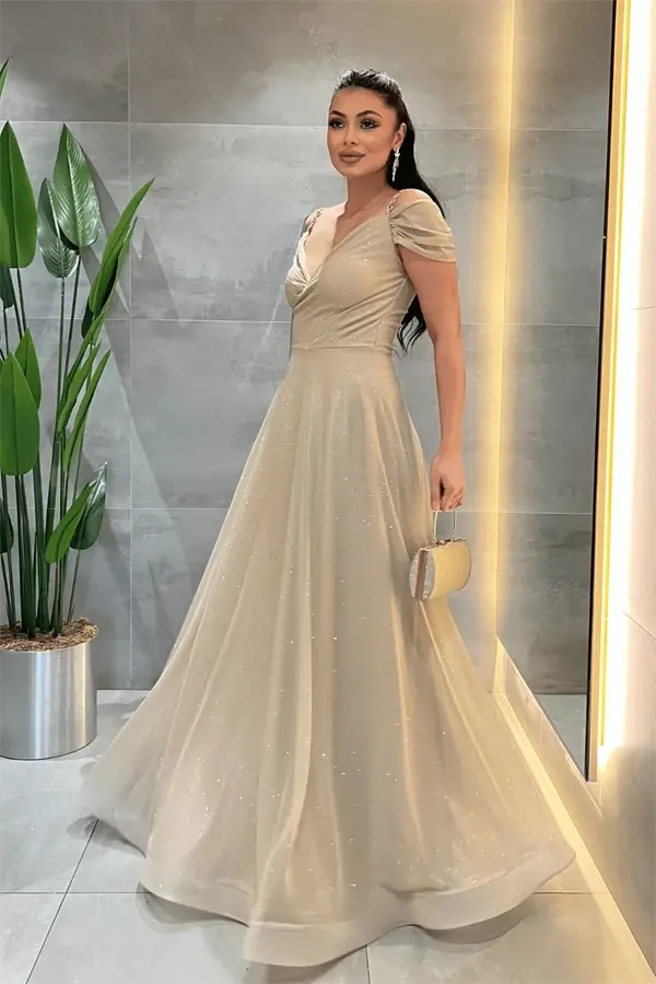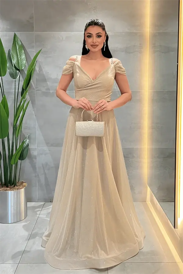 Simli Kumaş Kayık Yaka Abiye Elbise - GOLD