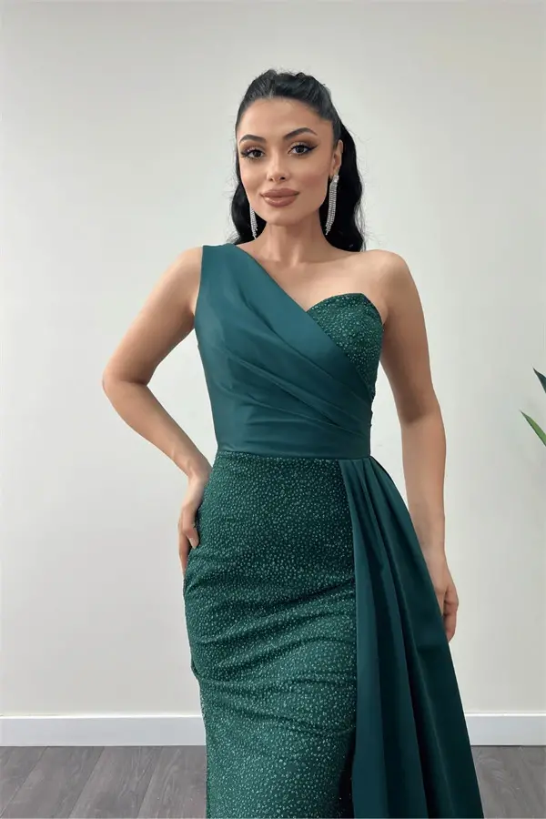 Simli Saten Kumaş Şal Detaylı Abiye Elbise - ZÜMRÜT YEŞİL