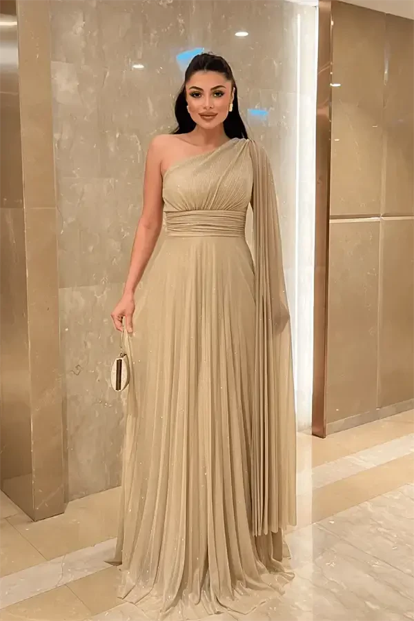Simli Tulli Plisse Detalli Bej Abiye Ko'ylak | Maxsus Tadbir Chiqishi