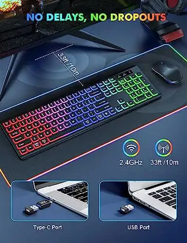 Qayta Zaryadlanuvchi va Yoritilgan Harflar: Batareya tashvishidan xalos bo'ling! Klaviatura va sichqoncha uzoq vaqt ishlash vaqтини ta'minlovchi qayta zaryadlanuvchi batareyalar bilan jihozlangan. Yoritilgan klavishlar hatto past yorug'lik sharoitida ham qulay va aniq yozish tajribasini ta'minlaydi.
