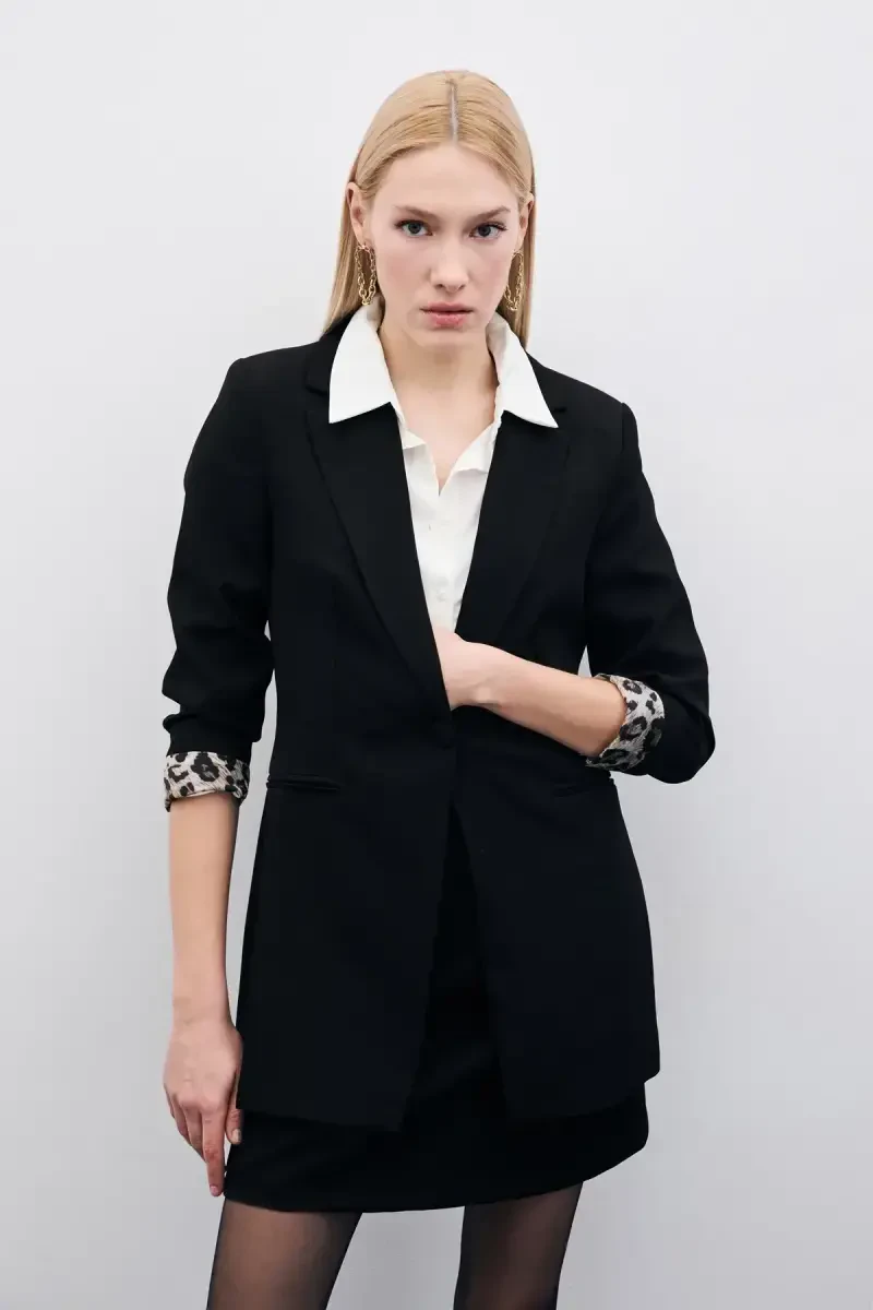 Own one of the cornerstones of your wardrobe with the Mono Collar Classic Jacket. With its timeless design and impeccable cut, this black jacket will accompany you in both daily use and special moments. Thanks to its quality fabric, it creates a feeling of elegance on you, while the mono collar detail offers a modern and sophisticated look. Whether you combine it with a stylish blouse and skirt, or complete it with a casual t-shirt and jeans, this jacket easily adapts to every style. From office elegance to weekend comfort, this jacket, which will make you stand out in any environment, is a candidate to be an indispensable item for stylish women. When the nobility of black and the classic stance of the jacket come together, this unique piece will be one of the most valuable pieces of your wardrobe. The mono collar detail adds a modern touch to the jacket, while the classic cut ensures that it is always trendy. With this jacket, you can feel both stylish and comfortable, and you can feel confident all day long. The quality of its fabric offers long-lasting use, while its easy-to-iron feature ensures that you always look well-groomed. Black color provides endless style options by matching with every combination. Whether you get a classic look or create a more sporty style, this jacket will accompany you in any situation. Choose the Mono Collar Classic Jacket to feel special and highlight your style.