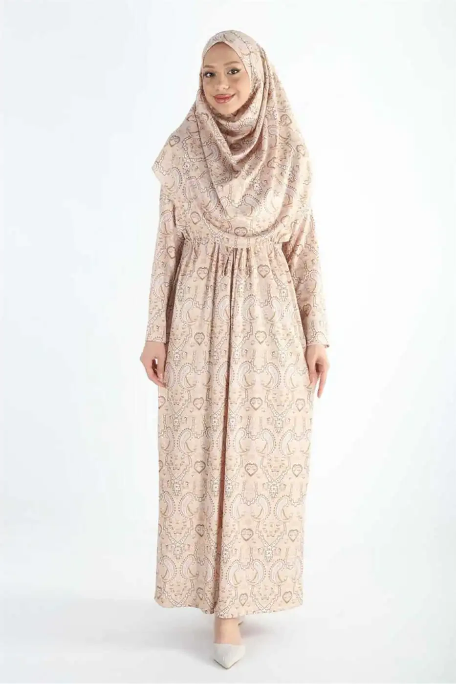 Specially designed for Muslim women, this prayer dress combines style and comfort. With its one-piece design, it offers both comfort and practicality, while its special fabric gives it a soft texture. The prayer dress, which has an eye-catching appearance with its patterned structure, is completed with an embroidered hijab. The dress, which can be used comfortably in all four seasons, allows you to perform your prayers comfortably at home and outdoors.