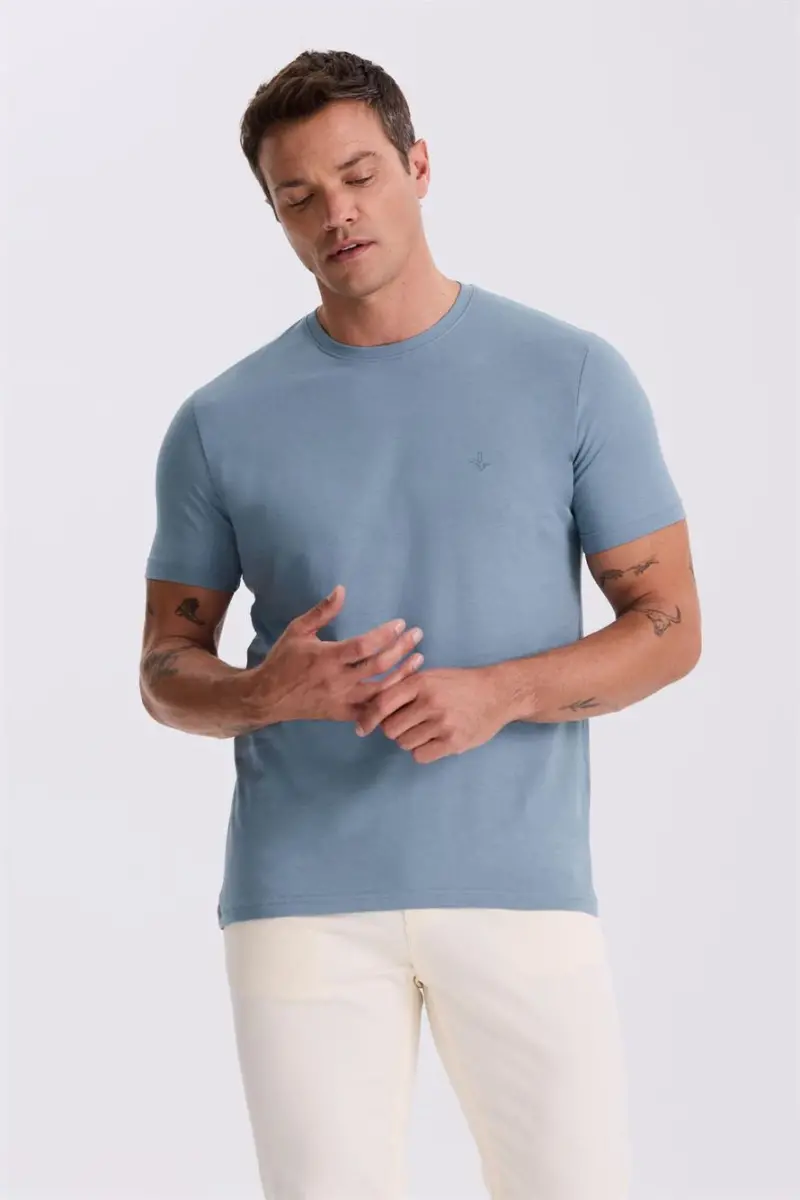 Продемонстрируйте свой стиль в самой естественной форме с помощью базовой футболки Slim Fit с круглым вырезом из 100% хлопка синего цвета. Эта футболка, благодаря своей мягкой текстуре, обеспечивает комфорт в течение всего дня, а её идеальный крой элегантно облегает фигуру. Классический круглый вырез и простой дизайн идеально сочетаются с любым вашим нарядом. Эта вневременная вещь, которая будет сопровождать вас в деловых встречах, повседневных делах, в выходные и на вечерних мероприятиях, обязательно должна быть в вашем гардеробе. Состав из 100% хлопка обеспечивает воздухопроницаемость и позволяет коже дышать естественным образом, гарантируя ощущение свежести и комфорта в течение всего дня. Качественная ткань и тщательная обработка обеспечивают длительный срок службы, и даже после многочисленных стирок футболка сохранит свой первоначальный вид. Футболка с силуэтом slim fit идеально садится по фигуре, элегантно подчеркивая контуры тела, при этом обеспечивая свободу движений. Идеально подходящая для повседневной носки, эта футболка может комбинироваться с различными цветами и принтами, позволяя добавить свой собственный штрих к вашему стилю. Сочетающая в себе простоту и элегантность, базовая футболка Slim Fit с круглым вырезом из 100% хлопка синего цвета — одна из базовых вещей, которые должны быть в гардеробе каждого мужчины. Идеальный вариант для тех, кто ищет сочетание качества, стиля и комфорта. Выглядите стильно и уверенно в себе в любой ситуации с этой футболкой!