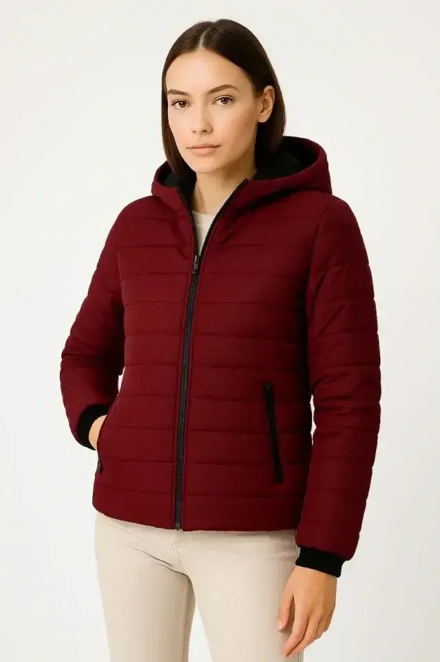 Şişme Kapüşonlu Fermuarlı Mont Su Itici Kapitone Astarlı Kumaş Cepli Kışlık Rahat Kalıp - BordoModelin Ölçüleri: Boy: 165, Kg: 55, Göğüs: 90, Bel: 72, Kalça: 100Modelin üzerindeki ürün M/38 bedendir