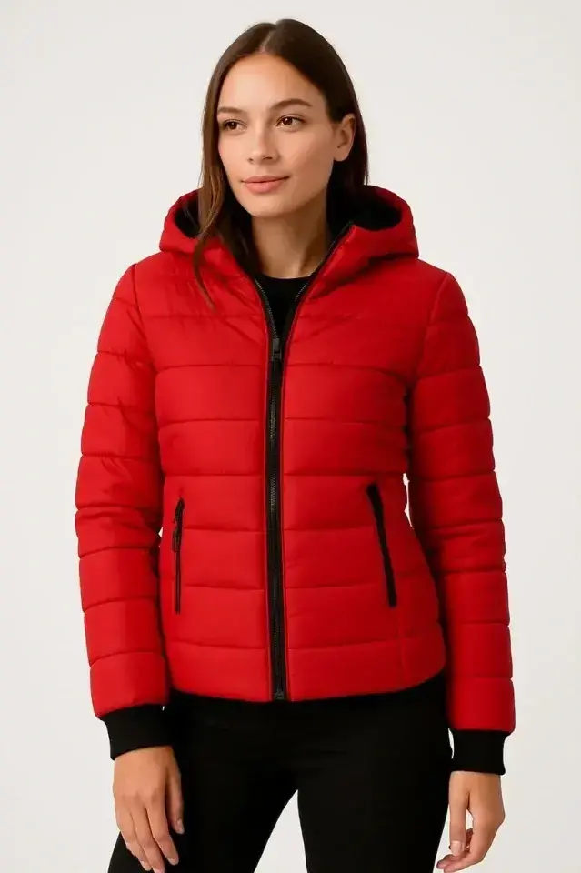 Şişme Kapüşonlu Fermuarlı Mont Su Itici Kapitone Astarlı Kumaş Cepli Kışlık Rahat Kalıp - KırmızıModelin Ölçüleri: Boy: 165, Kg: 55, Göğüs: 90, Bel: 72, Kalça: 100Modelin üzerindeki ürün M/38 bedendir