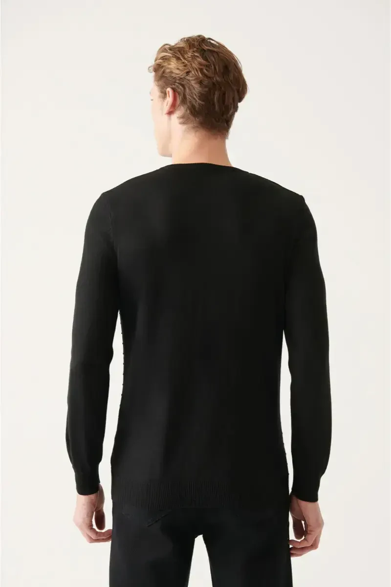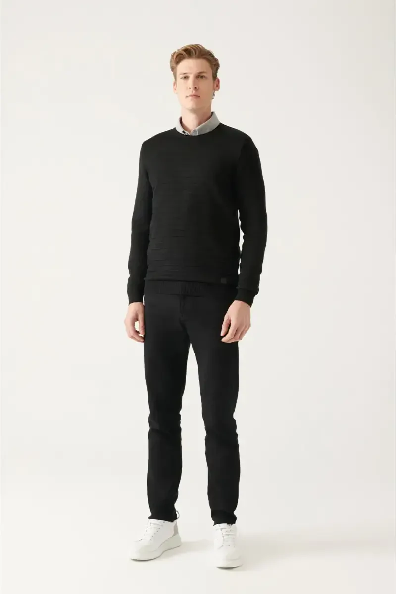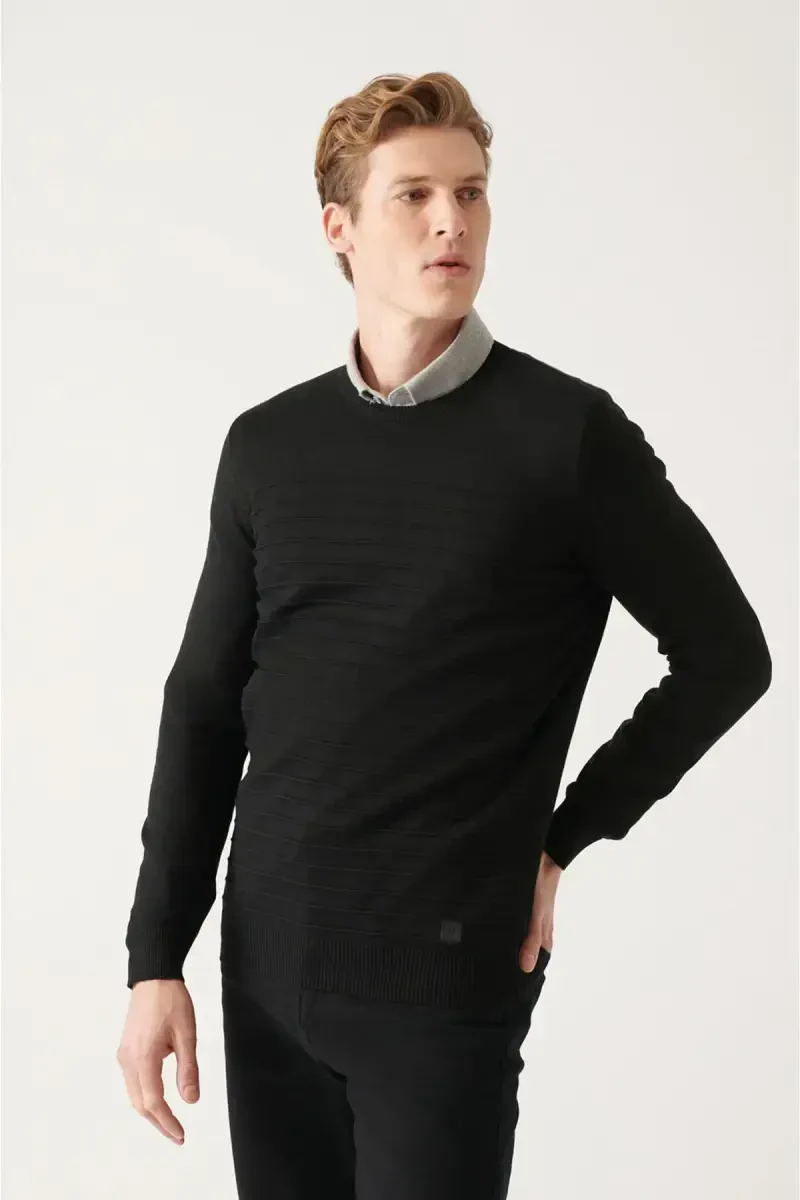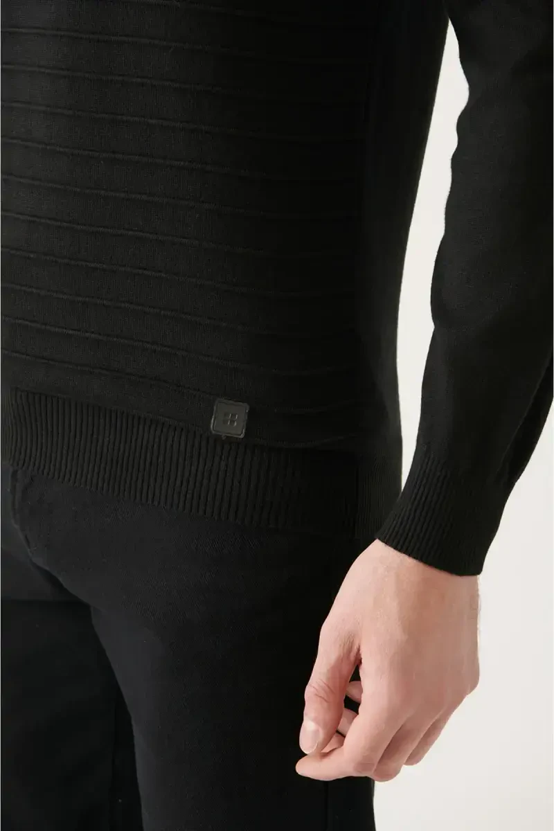 Erkek Siyah Bisiklet Yaka Örgü Detaylı Pamuklu Regular Fit Triko Kazak ile tarzınızı ve konforunuzu bir araya getirin!