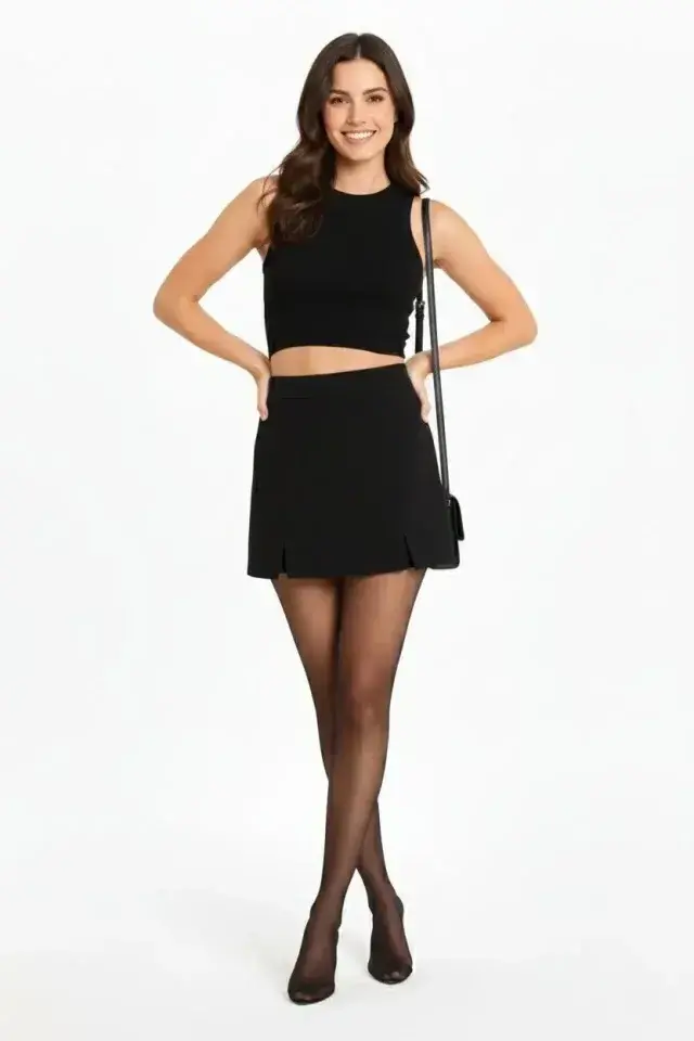 Siyah Krep Kumaş Şortlu Etek Mini Boy Yırtmaç Detaylı Yüksek Bel Günlük Şık Tasarım - Siyah