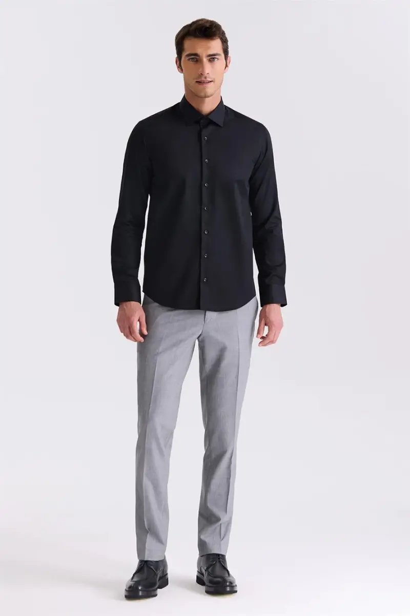 Siyah Slim Fit Basic Düğmeli %100 Pamuk Gömlek, şıklığı ve konforu bir araya getiren, her erkeğin gardırobunda olması gereken temel bir parçadır. Bu gömlek, modern kesimi, kaliteli kumaşı ve çok yönlü kullanım imkanıyla öne çıkar. İster günlük kullanımda, ister özel bir davette giyebilirsiniz. Her zaman şık ve bakımlı görünmenizi sağlar. %100 pamuktan üretilmiş olması, cildinize nefes aldırır ve gün boyu rahat etmenizi sağlar. Slim fit kesimi, vücudunuza oturarak daha fit bir görünüm sunar. Klasik düğmeli tasarımı, farklı tarzlara kolayca uyum sağlamasına olanak tanır. Jean pantolonlarla spor bir tarz yaratabilir, şık bir ceket ve kravatla kombinleyerek daha resmi bir görünüm elde edebilirsiniz. Siyahın asaleti, bu gömleği zamansız kılar ve her sezon giyilebilir hale getirir. Kaliteli dikişleri ve dayanıklı kumaşı sayesinde uzun yıllar boyunca ilk günkü gibi kullanabilirsiniz. Dolabınızın kurtarıcısı olacak bu gömlek, hem stilinizi yansıtmanıza yardımcı olur hem de konforunuzdan ödün vermemenizi sağlar. Her erkeğin stil sahibi ve özgüvenli görünmesine katkıda bulunur. Ofiste, toplantılarda, akşam yemeklerinde veya hafta sonu gezintilerinde rahatlıkla tercih edebileceğiniz çok yönlü bir parçadır. Siyahın klasik ve şık duruşu, her ortamda dikkat çekmenizi sağlar. Gardırobunuzdaki diğer parçalarla kolayca kombinlenebilir, farklı tarzlar yaratmanıza olanak tanır. Bu gömlek, sadece bir giyim eşyası değil, aynı zamanda bir stil ifadesidir. Kendinize yapacağınız en iyi yatırımlardan biri olacaktır. Hem rahatlığı hem de şıklığı bir arada arayan erkekler için ideal bir seçimdir. Siyah rengi sayesinde her türlü aksesuarla uyum sağlar ve tarzınızı kişiselleştirmenize olanak tanır. İster spor, ister klasik bir tarz benimseyin, bu gömlek her zaman size eşlik edecektir. Günümüz modasının vazgeçilmezlerinden olan slim fit kesim, vücut hatlarınızı ön plana çıkarırken, hareket özgürlüğünüzü kısıtlamaz. Gömleğin pamuklu dokusu, terlemeyi önler ve gün boyu ferah kalmanızı sağlar. Bu gömlek, stil sahibi erkeklerin vazgeçilmezi olmaya aday. Hem rahatlığı hem de şıklığı bir arada sunarak, her zaman iyi görünmenizi sağlar.