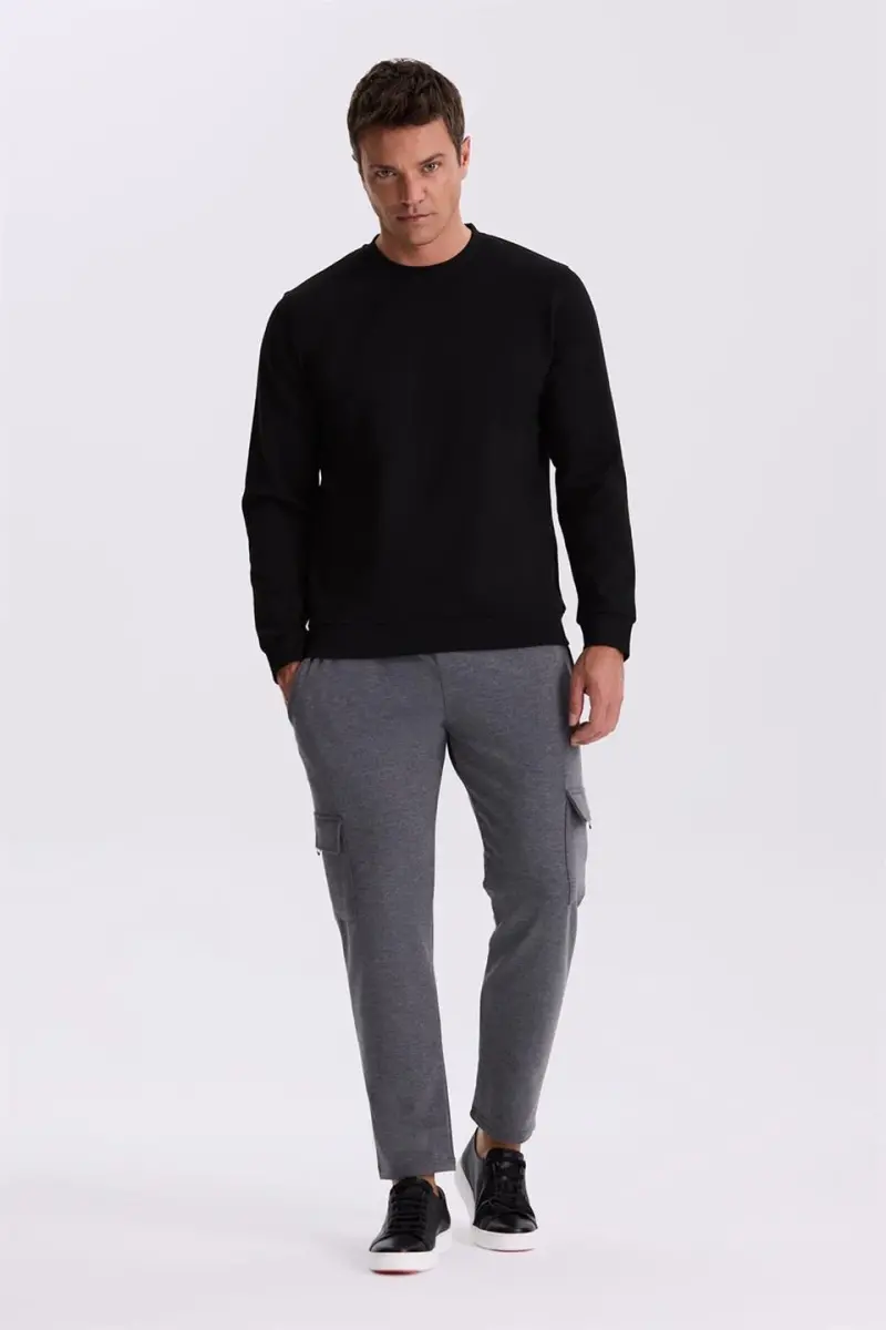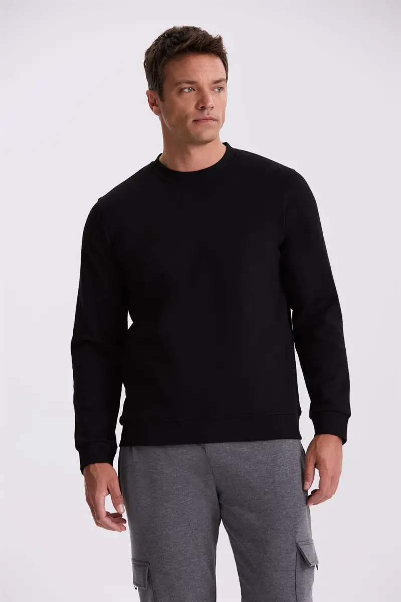 Siyah Slim Fit Bisiklet Yaka Basic Pamuklu Likralı Sweatshirt