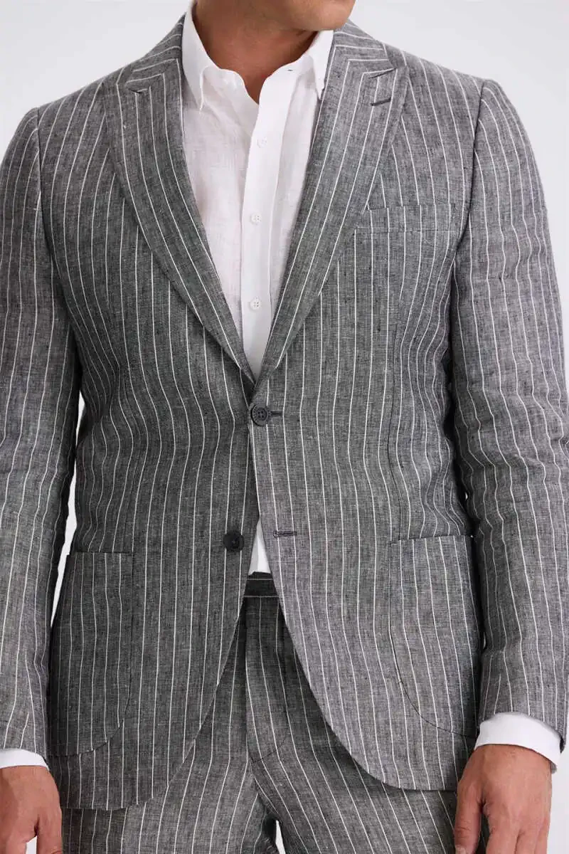 **Black Slim Fit Swallow Collar Double Vent 100% Linen Sports Suit****Material:**100% Linen**Features:*** Peak lapel* Slim fit* Double vent* Stripe pattern* Patch pockets**Measurements:*** Model Measurements: * Height: 189 cm * Chest: 100 cm * Waist: 81 cm * Hips: 97 cm* Model Size: 52**Benefits:*** Lightweight and breathable fabric* 100% natural and eco-friendly* Stylish and modern design* Suitable for all kinds of special occasions and events* Can also be worn comfortably for everyday wear