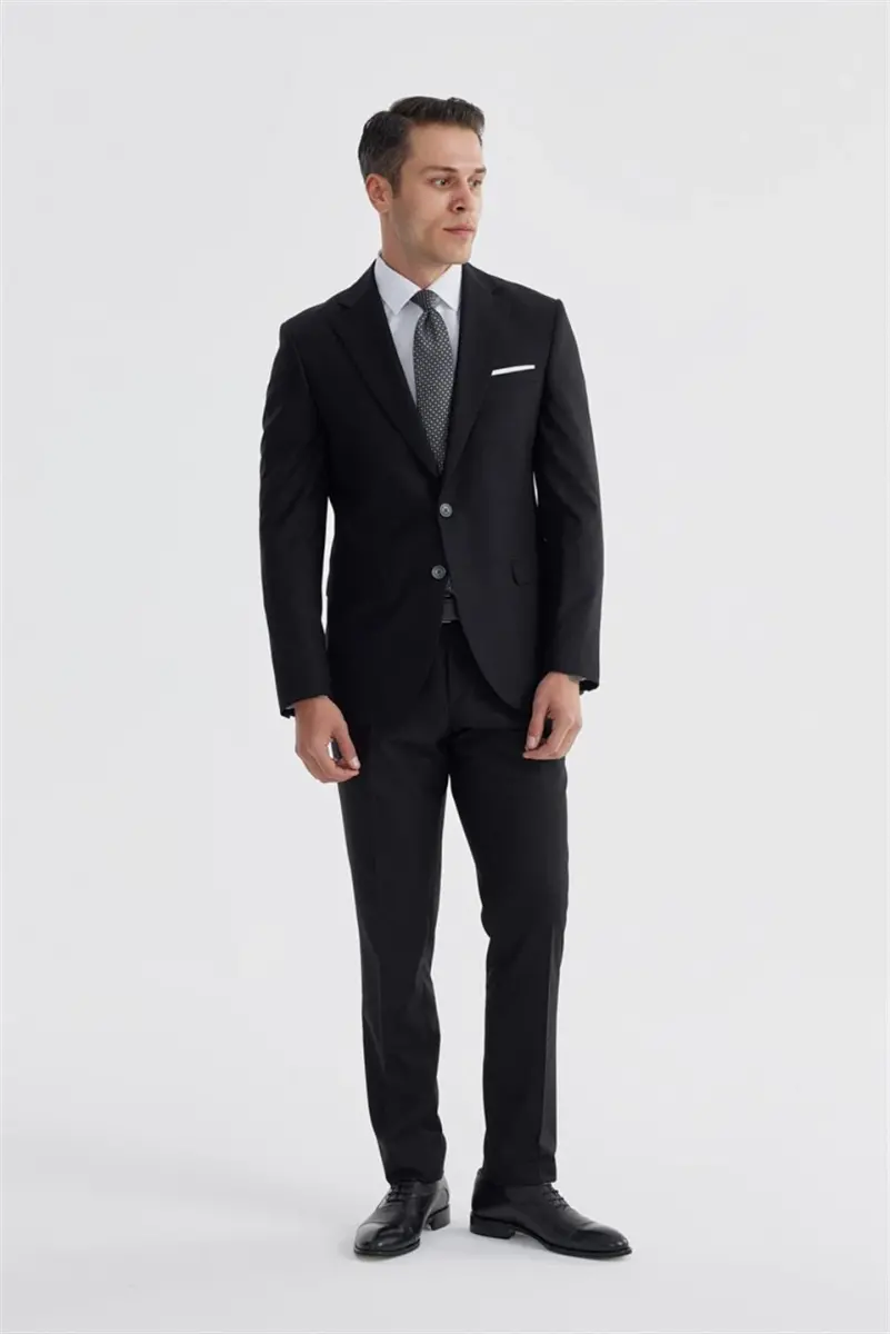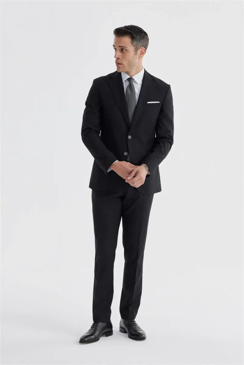 Siyah Slim Fit Mono Yaka Çift Yırtmaç Düz Takım Elbise
