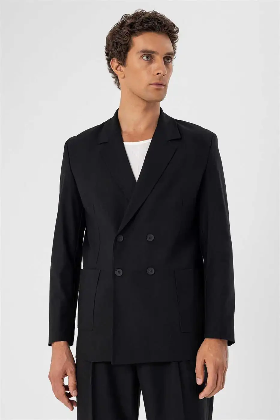 Şıklığı ve rahatlığı bir araya getiren siyah torba cepli kruvaze erkek blazer ceketimiz, gardırobunuzun olmazsa olmaz parçalarından biri olacak. Zarif kruvaze yakası ve klasik kesimiyle her ortamda dikkat çeken bir stil yaratmanızı sağlayacak bu ceket, günlük giyimden özel günlere kadar her türlü kombininize uyum sağlayacak.