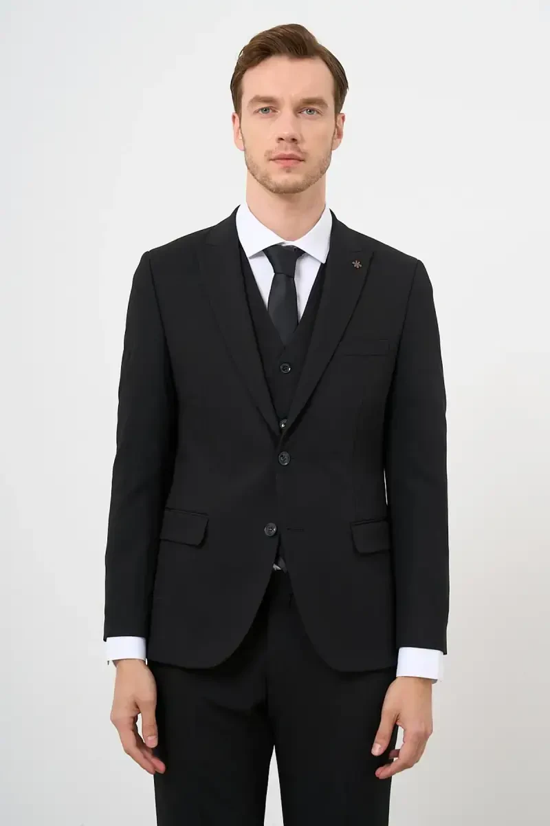 Siyah Yelekli Slim Fit Erkek Takım Elbise