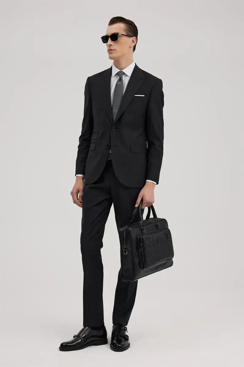 Поднимите свой стиль на новый уровень с черным шерстяным костюмом Slim Fit с заостренным воротником. Этот костюм сочетает в себе современный и элегантный вид и придаст вам уверенности в любой обстановке, от особых случаев до деловых встреч. Итальянский крой и облегающий силуэт Slim Fit сделают вас стройнее и харизматичнее. Черный цвет костюма - это классический и вневременной вариант, который легко сочетается с любой рубашкой и галстуком. Благодаря высококачественной смесовой шерстяной ткани он выглядит элегантно и обеспечивает комфорт в течение всего дня. 88% шерсти в составе ткани придает костюму естественное тепло и воздухопроницаемость, 9% полиамида повышают прочность ткани и минимизируют образование складок. 3% эластана обеспечивают идеальную посадку, не ограничивая свободу движений. Заостренный воротник придает костюму современный вид и добавляет изысканности вашему образу. Идеальное сочетание пиджака и брюк подчеркивает ваш силуэт и создает элегантный образ. Детали пуговиц и внутренняя подкладка также были тщательно подобраны, чтобы вы могли почувствовать качество костюма в каждой детали. Этот костюм станет незаменимой частью вашего гардероба и прослужит вам долгие годы. Наденьте его на званый вечер или на важную деловую встречу, в черном шерстяном костюме Slim Fit с заостренным воротником вы всегда будете выглядеть стильно. 50-й размер на модели может служить ориентиром для идеальной посадки. Выберите подходящий вам размер, чтобы получить вид, который идеально сидит на вас и наилучшим образом отражает вас. Помните, что стиль кроется в деталях, и этот костюм предлагает вам совершенство в каждой детали.