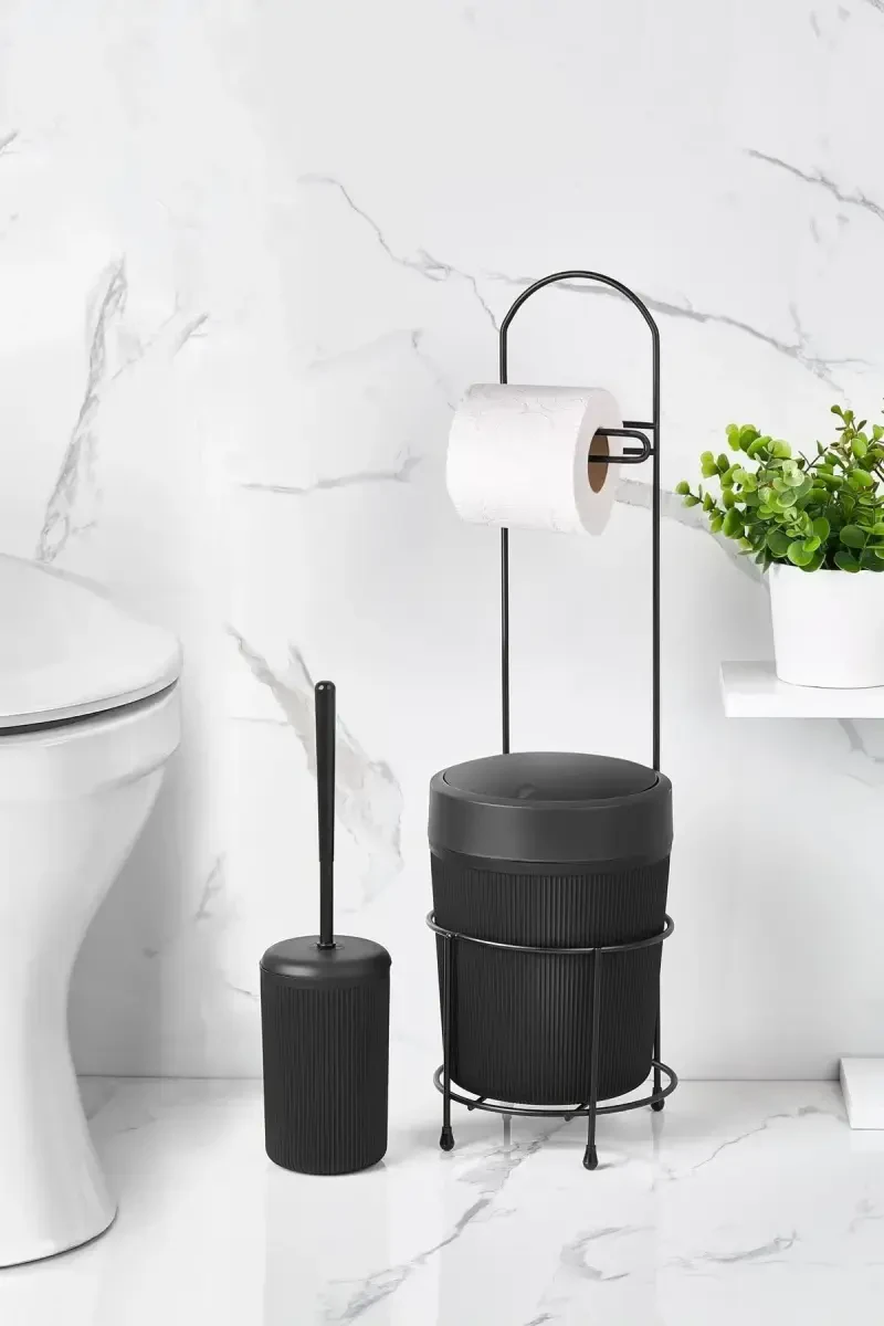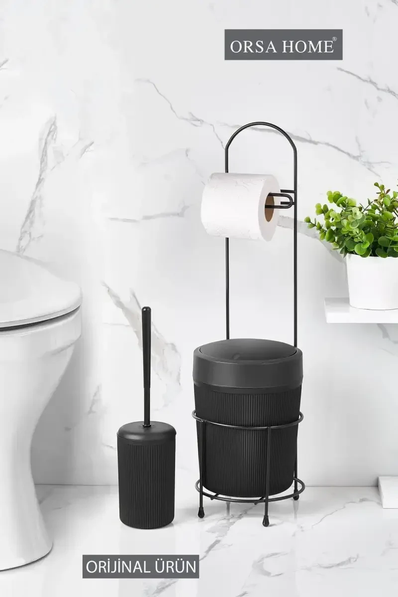 Are you looking for a stylish and functional solution to recreate the atmosphere of your bathroom? Meet the ORSA HOME Matte Black Coated, Round Bucket Toilet Paper Holder and Toilet Brush Set! This elegant set is designed to add a modern and sophisticated touch to your bathroom. Made of quality materials, it is a durable and long-lasting product. Its stylish matte black finish perfectly matches any bathroom decor. The easy-to-open trash can offers hygienic and practical use. With a special compartment for toilet paper rolls and a stylish toilet brush, it provides order and cleanliness in your bathroom. This set, which is 100% domestic production, will be delivered to you directly from the factory, in its box and safely, by ORSA HOME Metal A.Ş., the leader of the sector. This set, which will add value to your bathroom with its aesthetic design, will also make your daily life easier with its usability. It is an ideal choice for those who seek both elegance and practicality. Our product consists of a trash can and toilet brush made of quality plastic material and a durable metal stand with a matte black coating. It has an ideal size with a height of 64 cm. The 4.5 liter capacity trash can eliminates the need for frequent emptying. The special design of the toilet brush provides effective cleaning. Make your bathroom more organized, clean and stylish with this product.