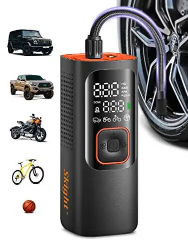 Meet the Skight Portable Air Compressor! This is everything you need to quickly and easily inflate your car, motorcycle, e-bike tires, or ball. Save time with its powerful 150 PSI power and inflation speed that's twice as fast as others. The high-precision LCD screen accurately displays real-time pressure readings and automatically shuts off when the preset pressure is reached, eliminating the risk of overinflation. Its cordless, rechargeable design allows for use anywhere, providing long-lasting use with its high-capacity 7500mAh battery for more power and flexibility. It easily adapts to your different needs with 5 different inflation modes (car, motorcycle, bicycle, ball, manual). The durable nylon braided air hose is resistant to high temperatures, and it operates quietly with noise reduction technology. It offers practical features such as integrated LED lighting for easy nighttime use and a USB output for charging your phone. Its compact and lightweight design makes it easy to carry. The Skight Portable Air Compressor is a perfect tool to simplify your life with its reliable performance, user-friendly design, and versatility. No more worrying when you're stranded on the road or need to inflate a tire at home.