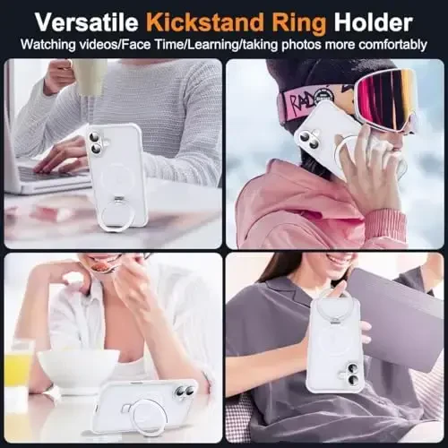 Protect your phone in style and take advantage of its advanced features with the SKYLMW iPhone 17 case! Specifically designed for the iPhone 17 6.3" model, this case stands out with its military-grade drop protection, Mag-Safe compatibility, and convenient magnetic ring stand. Its transparent design preserves the original beauty of your phone while its robust construction provides superior defense against the rigors of daily use. The magnetic ring stand, made from aerospace-grade aluminum, not only offers a stylish look but also provides a practical solution for hands-free use of your phone. With an adjustable stand angle between 40° and 120°, you can easily find the ideal position for watching videos, making video calls, or simply checking your notifications. The stand also functions as a ring holder, allowing you to hold your phone more securely by putting your fingers through it. Its strong magnetic structure ensures seamless compatibility with Mag-Safe accessories thanks to its 24 N52 magnets. You can now easily connect to wireless chargers, safely use magnetic car mounts, and enjoy a hassle-free experience with other Mag-Safe enabled accessories. The strength of the magnets is high enough to securely hold your phone in a car mount during city use. The SKYLMW iPhone 17 case is not only stylish and convenient but also offers superior protection. The distinctive air cushions in all four corners and the raised frame design protect your phone's screen and camera lens from scratches and impacts. Thanks to military-grade drop protection, it minimizes the risk of damage to your phone even in accidental drops. The combination of a translucent polycarbonate back and soft TPU edges makes the case look stylish and offers an excellent grip. Its non-slip structure allows you to hold your phone more securely in your hand. In addition, its fingerprint-resistant surface ensures that your case always looks clean and new. The SKYLMW iPhone 17 case allows you to protect your phone while reflecting your style. Its transparent design allows you to showcase the color and design of your phone, while military-grade protection and Mag-Safe compatibility allow you to take advantage of all the benefits of modern technology.