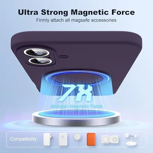 Чехол SKYLMW с магнитным невидимым стендом для iPhone 16 разработан для защиты вашего телефона и обеспечения простоты использования. Этот чехол обеспечивает превосходную защиту для вашего телефона благодаря совместимости с MagSafe и амортизирующей силиконовой конструкции, прошедшей испытания на падение по военному стандарту. Этот фиолетовый чехол идеально подходит для 6,1-дюймовой модели iPhone 16, сочетая в себе стиль и функциональность. Самая заметная особенность - встроенная магнитная подставка, которая позволяет легко использовать телефон в горизонтальном или вертикальном положении. В закрытом состоянии подставка полностью невидима и интегрирована в чехол, что обеспечивает элегантный и минималистичный вид. Регулируемый угол наклона подставки от 40° до 120° обеспечивает максимальный комфорт при просмотре фильмов или видеозвонках. Благодаря мощным магнитам он совместим со всеми аксессуарами MagSafe и делает процесс беспроводной зарядки непрерывным. Задняя поверхность чехла имеет многослойную структуру, обеспечивающую превосходную защиту от ударов, отпечатков пальцев и пятен. Поднятые края вокруг камеры и экрана создают дополнительный слой защиты от царапин и пыли. Шелковистый силиконовый материал приятно ощущается в руке и позволяет надежно удерживать телефон. Мягкая подкладка из микрофибры внутри защищает заднюю поверхность телефона от царапин. Чехол SKYLMW для iPhone 16 - идеальный выбор как для женщин, так и для мужчин. Он не только защищает ваш телефон при повседневном использовании, но и помогает выразить свой стиль благодаря элегантному дизайну.