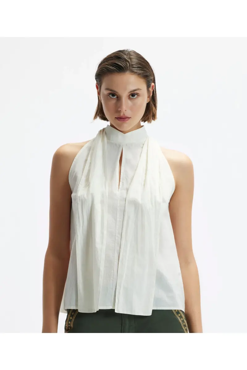 Combining style and comfort, the sleeveless collared tie blouse will become an indispensable part of your wardrobe. Its collared design and tie detail offer a chic look, while its sleeveless design will keep you cool in hot weather. Made from a lightweight and breathable fabric, the blouse provides comfortable wear all day long.