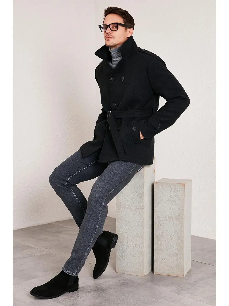 Erkek Dar Kesim Uzun Kaşe Kaban-Siyah