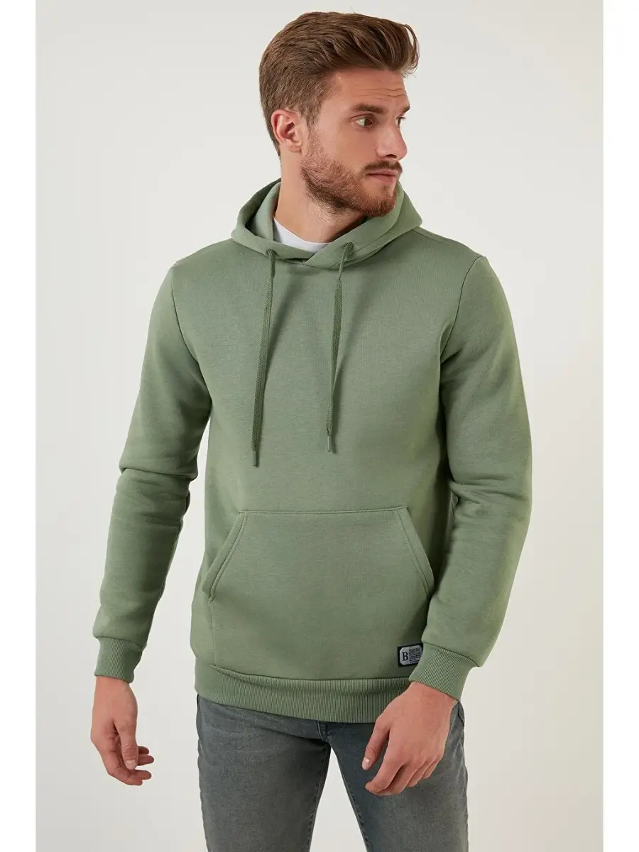 Slim fit kesim, kapüşonlu, kanguru cepli, içi tüylü, yumuşak şardonlu kumaş.