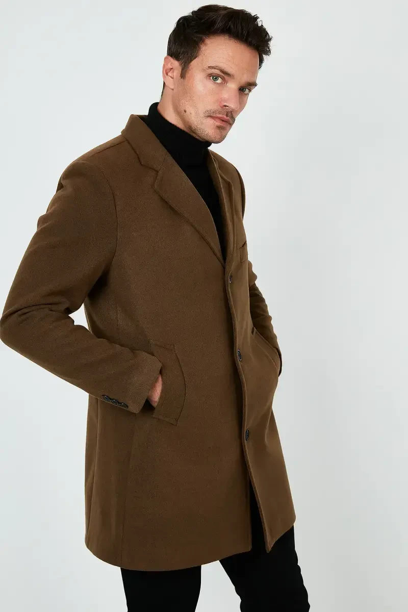 This cashmere coat, which combines elegance and sophistication, will become a staple in your wardrobe. The slim fit design hugs your body perfectly, while the single-breasted buttoned front closure adds a touch of elegance. The mono collar detail provides a modern look. Made from high-quality cashmere fabric, the coat keeps you warm while providing a stylish look.