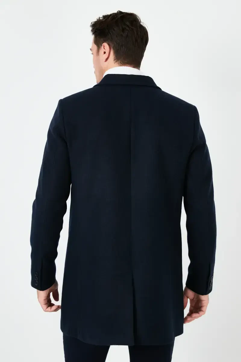 The Slim Fit Single Breasted Buttoned Notch Lapel Wool Blend Coat is a design that combines elegance and comfort, and is a candidate to be an indispensable part of the modern man's wardrobe. It keeps you warm in cold weather while ensuring you don't compromise on your style. The noble stance of the navy blue color adapts to any environment, highlighting your elegance in both daily use and special occasions. The slim fit cut of the coat gently emphasizes your body lines, offering a fit look. The single vent detail adds a modern touch without restricting your freedom of movement, while the button closure system offers practical use. The notch lapel design complements the coat's elegance, creating a sophisticated atmosphere. This wool blend coat, produced with Buratti quality, will continue to be your wardrobe's favorite piece for many years thanks to its durable material. It is an ideal choice for men who want to stay warm and look stylish in autumn and winter. The pocket detail on the inside of the coat allows you to safely carry your personal belongings. Being domestically produced shows that the quality standards are high and that it is the product of careful workmanship. This coat has details that will appeal to stylish men and is a stylish option to complete all your combinations. This product, offered with Markastok assurance, also attracts attention with its discounted price. Don't miss this product, which is available in limited quantities!