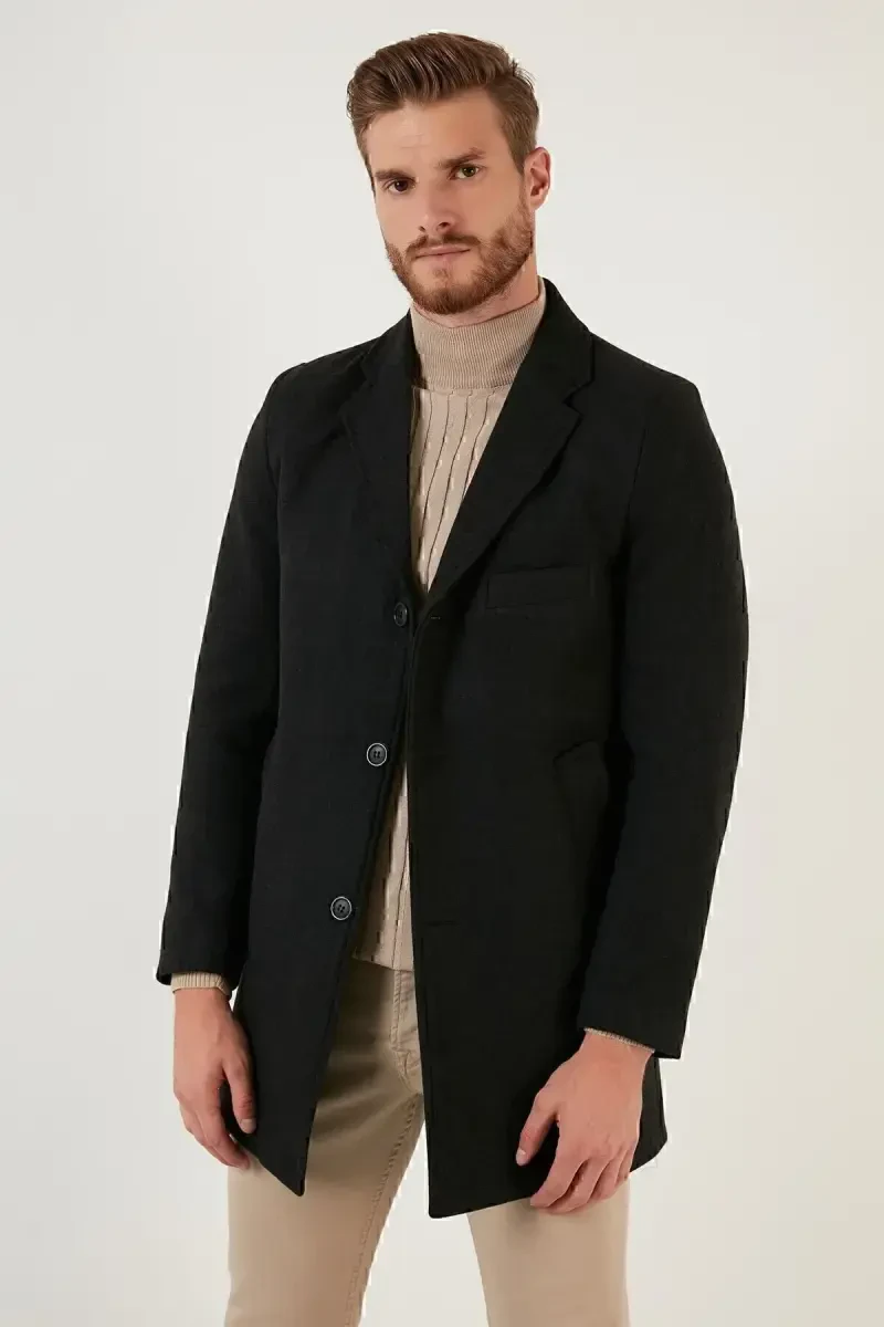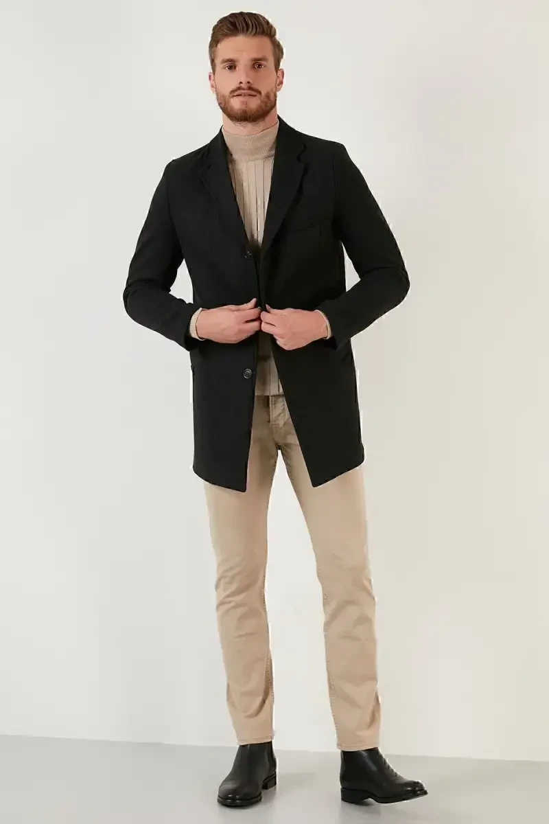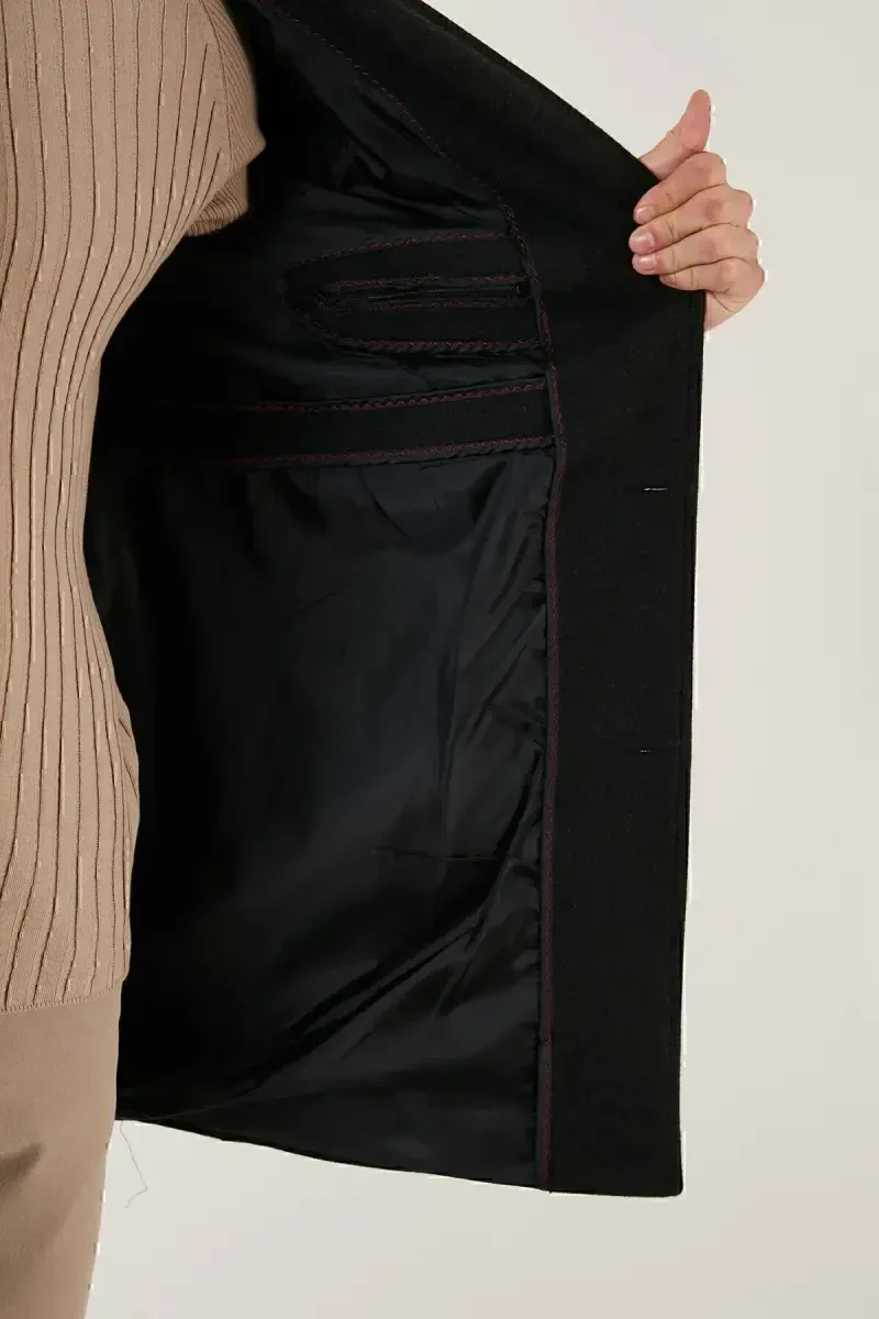 This charcoal gray cashmere coat, which stands out with its slim fit cut, single vent detail, button-front closure, and notched lapel design, is a must-have in the modern man's wardrobe. This coat, which keeps you warm in cold weather and complements your style, offers long-lasting use thanks to its high-quality cashmere fabric. The charcoal gray color can easily adapt to different styles, while the slim fit cut provides a modern look with its body-hugging structure. The single vent detail offers comfortable use without restricting freedom of movement, while the button-front closure reinforces the coat's elegance. The notched lapel design combines classic and modern lines to create a timeless style. You can easily prefer this coat in business life, special occasions or daily use, and it helps you reflect your style in any environment. Thanks to its inner lining, wearing comfort is increased, and its pockets allow you to safely carry your personal belongings. This cashmere coat, which attracts attention with its quality workmanship and stylish design, is an ideal choice for men who want to be stylish in cold weather. This coat, which you can easily combine with other pieces in your wardrobe, offers both stylish and functional use. The elegance of the charcoal gray color and the warmth of the cashmere fabric come together to offer a coat experience that will be indispensable in winter months. Every detail is carefully thought out, making this cashmere coat of a quality that will meet the expectations of men who seek both quality and elegance. You can choose this charcoal gray cashmere coat to stay warm while protecting your style in cold weather. Offering style and comfort together, this coat is a candidate to be one of the most valuable pieces in your wardrobe. It is an investment that you can enjoy for many years thanks to its modern design and quality material. This coat is not just a piece of clothing, but also a style statement.