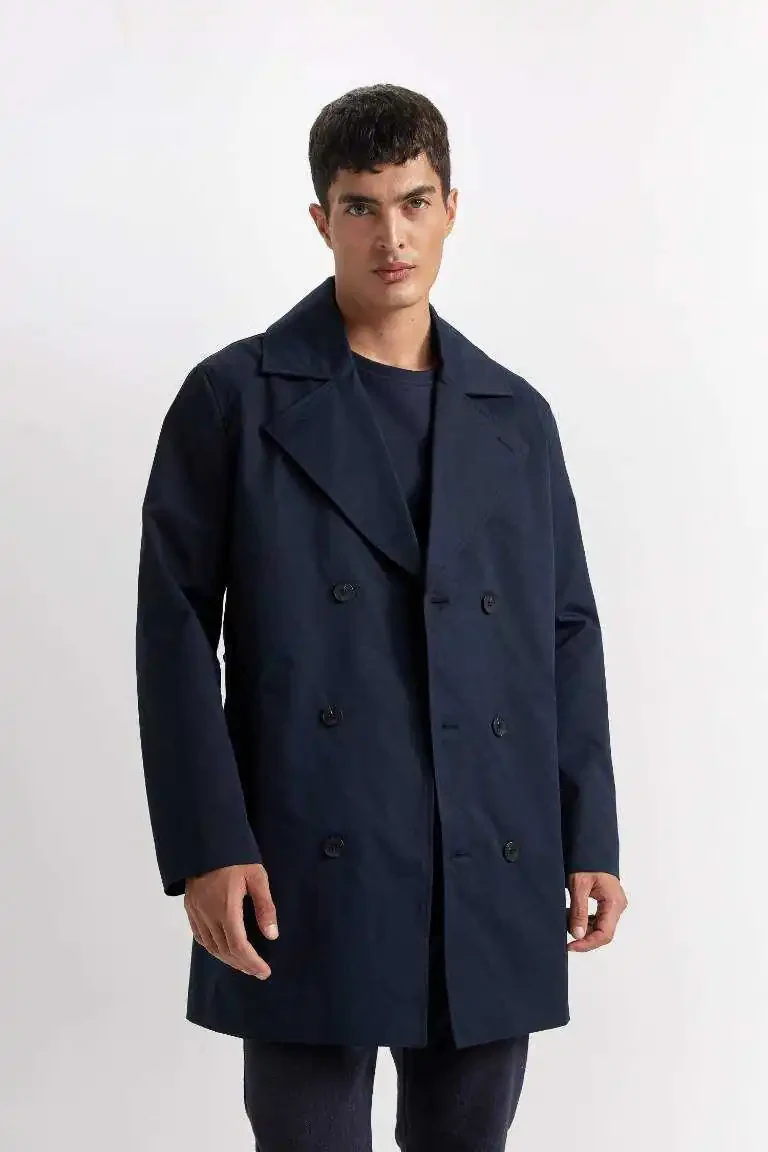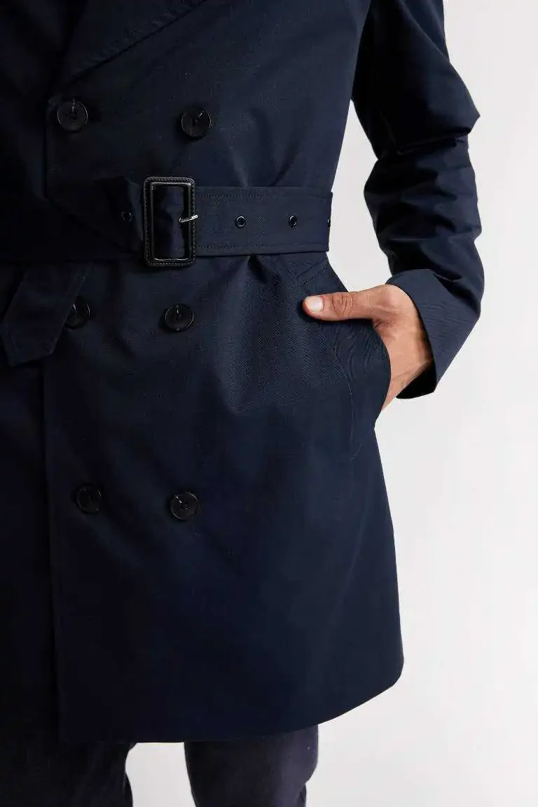 Slim Fit to‘q ko‘k trench: Tor bichim, tugmali, kamarli nafislik