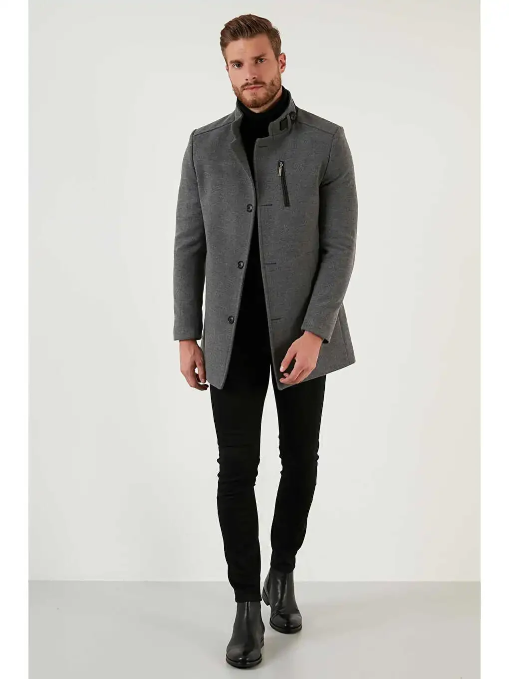 Slim Fit Tugmachali Tik Yaka Kashemirdan Palto sovuq qish kunlarida zamonaviylikdan voz kechmasdan iliq qolishni istaganlar uchun ajoyib tanlov.