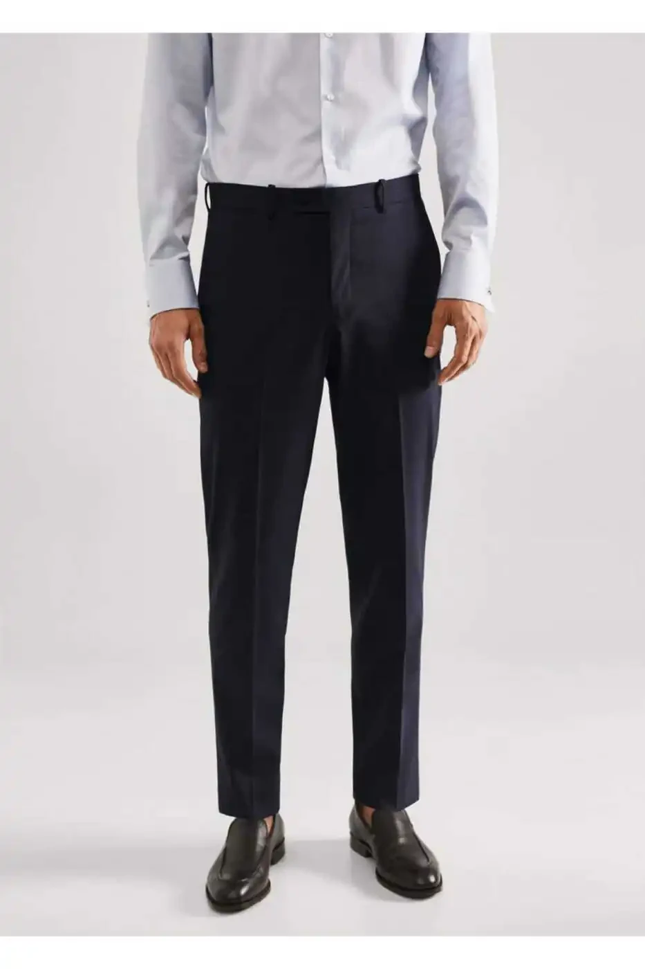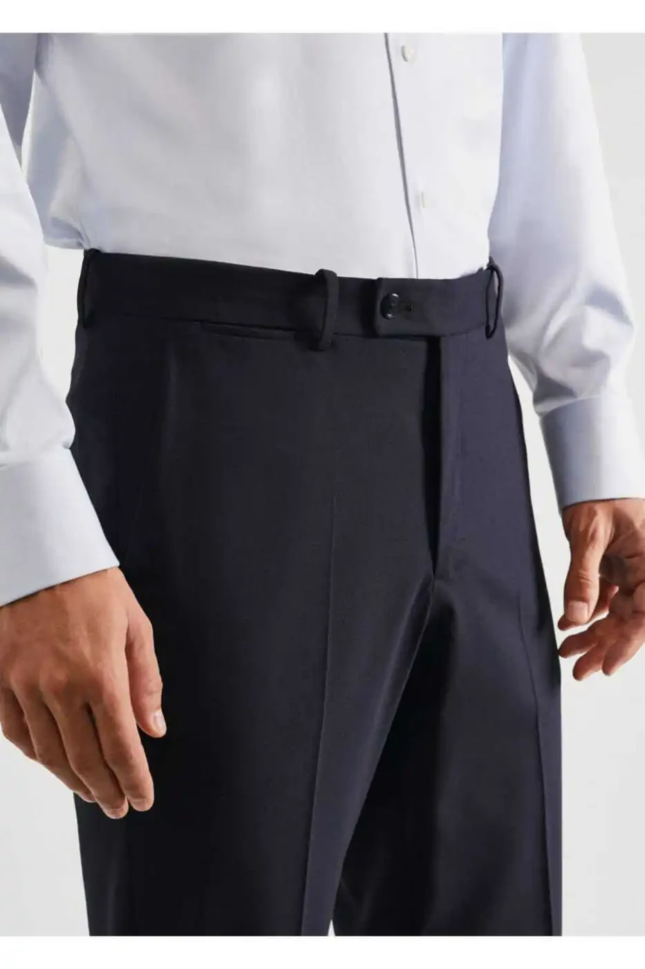 From the Performance Collection, these Slim Fit Wool Fabric Trousers are slim-fit, made from fine fabric, with a regular waist, belt loops, button, snap and zip closure, front and back snap details, two side pockets, and two buttoned back welt pockets. Made from 53% polyester, 24% viscose, 20% wool, and 3% elastane, these trousers feature thermoregulation, bi-stretch fabric that stretches in two directions for added comfort, and are wrinkle-resistant, ensuring you look your best and, most importantly, feel comfortable all day long, no matter what you do or where you go. Performance garments are made from technical fibers designed to keep you looking sharp and feeling your best all day long, no matter what you do or where you go. Performance products are classified into four general categories: thermoregulating, functional, easy-care, and comfort. They are fabrics with various advanced features such as bi-stretch, quick-drying, easy ironing, thermoregulation, breathability, and water repellency. Lining pocket: 55% cotton, 45% polyester. Inseam: 84.9 cm. Side seam length: 113.0 cm. DO NOT WASH, DO NOT BLEACH, IRON AT MAX. 110°C, DRY CLEAN WITH PERCHLOROETHYLENE, DO NOT TUMBLE DRY