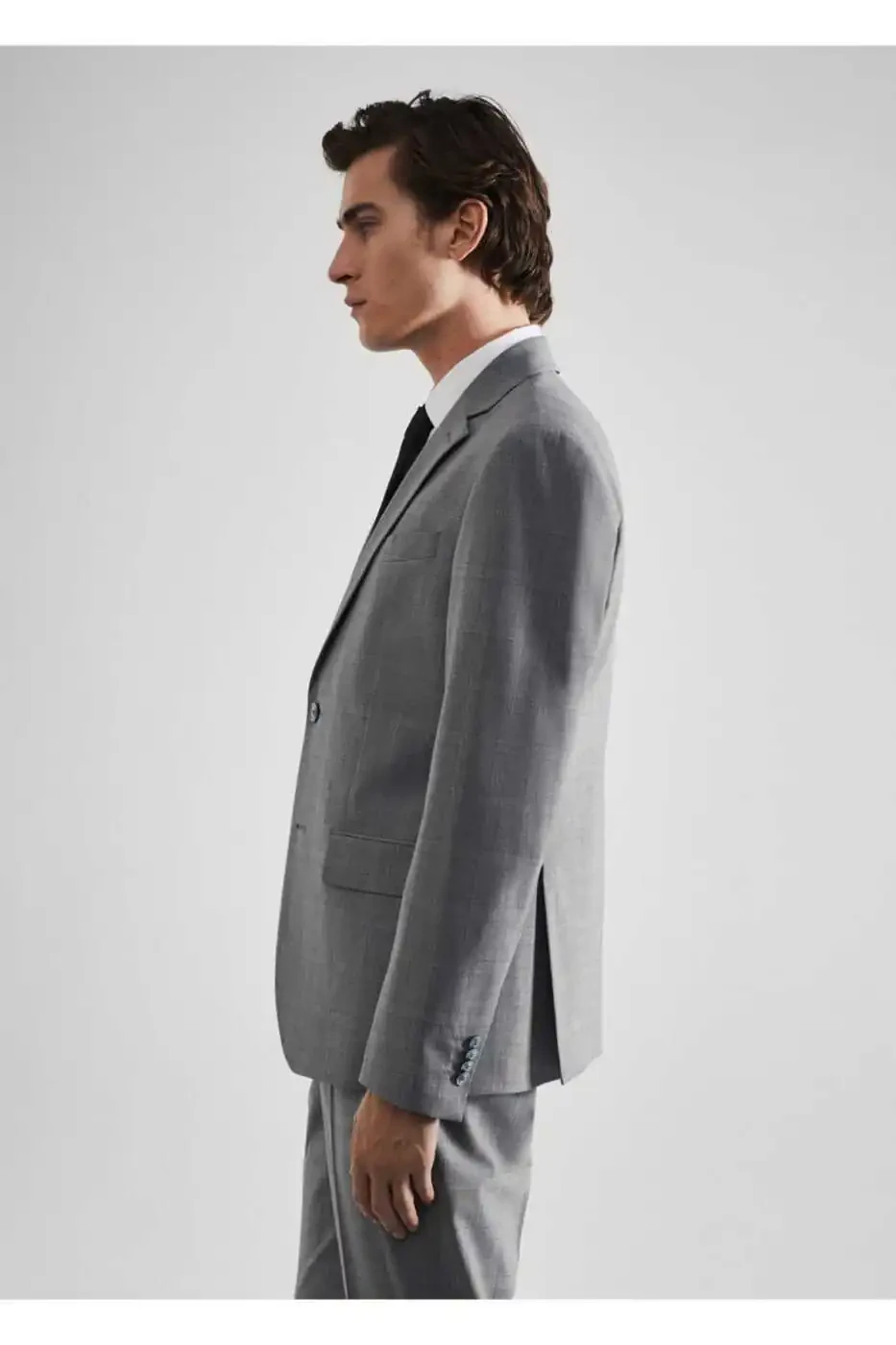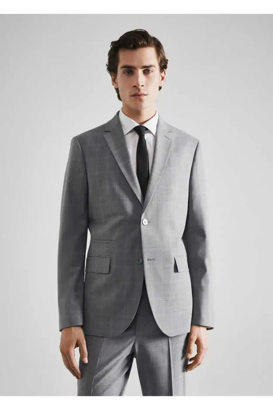 Complete your professional look with our stylish and timeless Slim Fit Wool Plaid Suit.Crafted from a luxurious blend of 41% wool, 40% recycled polyester, 14% polyester, and 5% elastane, this suit offers both sophistication and durability. The recycled polyester makes an eco-friendly choice while providing unique attributes such as wrinkle resistance.The slim fit cut elegantly contours to your body, creating a modern silhouette. The glen plaid pattern adds a classic touch that makes your suit stand out.The blazer jacket features a notch lapel, buttoned long sleeves, and a breast welt pocket for a refined look. Two flap pockets and two interior pockets provide ample space for your essentials.The trousers offer a regular fit for a comfortable seat and ease of movement. The side seam length measures 49.7 cm, while the back length is 79.1 cm.This suit regulates your body temperature with its thermoregulation feature, keeping you comfortable throughout the day. The bi-stretch fabric ensures a perfect fit and comfort with its flexible construction.Pair our slim fit suit with a sweater, t-shirt, or a classic dress shirt and tie for special occasions to achieve both formal and relaxed styles.Please follow these care instructions for optimal maintenance:* Do not wash* Do not bleach* Iron at maximum 110°C* Dry clean with perchloroethylene* Do not tumble dry