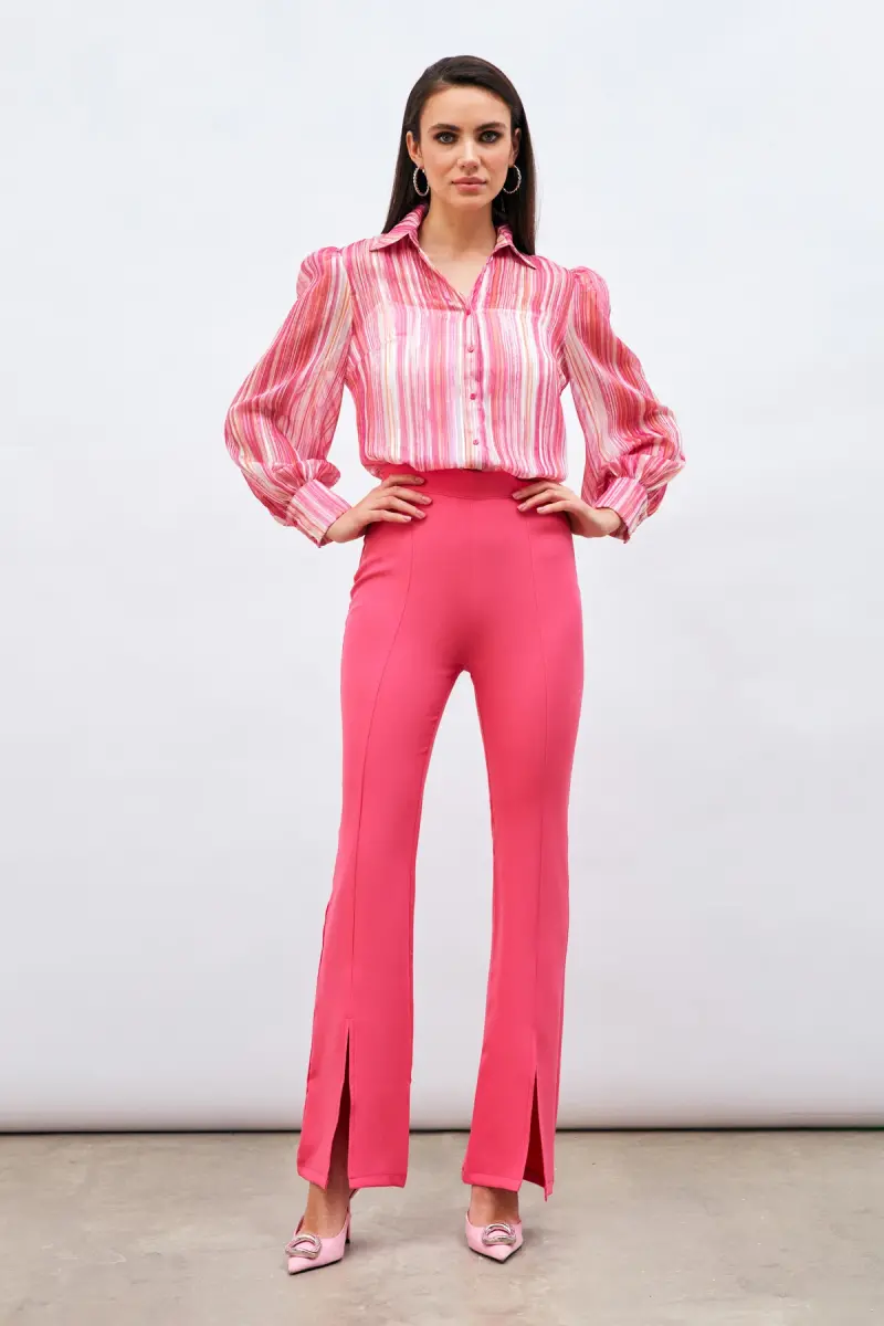Slit Detail Flared Pants - Fuchsia, is a candidate to be one of the most striking pieces of your wardrobe! You will make a difference in any environment with this vibrant and energetic fuchsia color, and you will add a modern touch to your elegance with its flared cut. The high waist design perfectly reveals your body lines while offering comfortable use all day long. Flexible crepe fabric fits perfectly on you without restricting your freedom of movement and supports your stylish look. The slit detail on the side of the trousers adds a unique touch to the design, while also making your legs look longer. You can easily combine these trousers with different combinations, whether you prefer them for a special occasion or for your daily elegance. You can get a more elegant look by combining it with high heels, or you can create a more comfortable and stylish style with sneakers. This fuchsia tone, which will also be in harmony with your accessories, helps you reflect your vitality in all seasons. Let your style speak with Slit Detail Flared Pants - Fuchsia, and reflect your confidence with every step! It is an ideal choice for women who both follow trends and do not want to compromise on their comfort. When you wear these trousers, you will not only look stylish, but also feel good. Thanks to its flexible structure, you can move comfortably throughout the day, and thanks to its special design, you can attract all the attention. These trousers, which will be an indispensable part of your wardrobe, will add a different touch to each of your combinations and will always take you one step further.