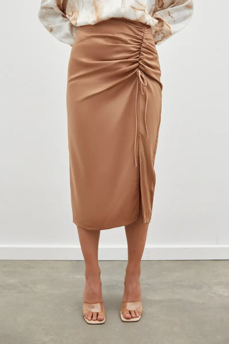 Ruched Detail Satin Skirt creates a feeling of a silk touch on you thanks to its high quality satin fabric. The slight shine of the fabric adds a separate dimension to the skirt, while the ruched details add a lively and modern feel. The cut of the skirt gently reveals your body lines and makes you look taller and slimmer than you are. The warm tone of camel color keeps you warm, especially in autumn and winter, and adds a warm touch to your style. The elastic band at the waist of the skirt offers comfortable use throughout the day, while allowing the skirt to be easily put on and taken off. Ruched details add movement to the skirt, while also being designed to suit different body types. In this way, it ensures you look great in every body. The skirt can be easily combined with both high heels and flats. You can prepare for a special invitation by combining it with a classic shirt or a stylish blouse, or you can create a more comfortable style with a casual t-shirt and sneakers. Ruched Detail Satin Skirt will be one of the most loved pieces of your wardrobe thanks to its versatile use. Its timeless design is an investment piece that you can use for many years without going out of fashion. Whether in daily use or at special events, feel special with this skirt that will always highlight your elegance.