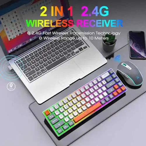 Snpurdiri 60% Беспроводной Игровой Комплект Клавиатура и Мышь - Радужная Подсветка, Аккумулятор 2000mAh, Мини-механическая, RGB Мышь - Игры, Офис