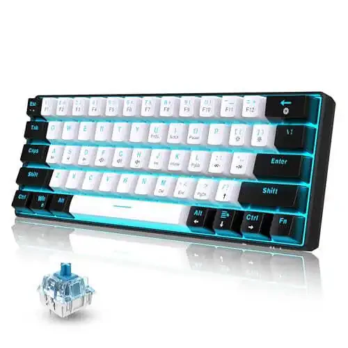 Snpurdiri 60% Wired Mechanical Gaming Keyboard, Ice Blue LED Backlit 61 Keys Mini Wired Office Keyboard for Windows Laptop PC Mac (Black-White, Blue Switches)