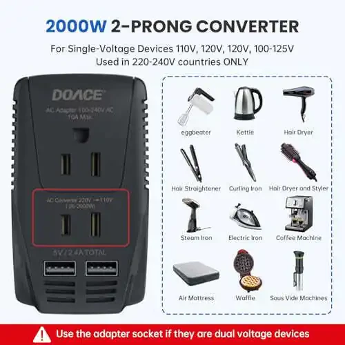 DoAce 2000W Sayohat Voltaj Konvertori 220V dan 110V ga o'zgartirish xususiyati bilan soch quruqlagich, to'g'rilagich, buqlaydigan temir va boshqa yuqori quvvatli jihozlaringizni dunyoning istalgan joyida ishlatishingizga imkon beradi. 10A quvvat adapteri bilan xavfsiz va samarali ishlaydi. Shuningdek, 2 ta USB chiqishi bilan mobil telefon, planshet va boshqa qurilmalarni ham zaryad qilishingiz mumkin.