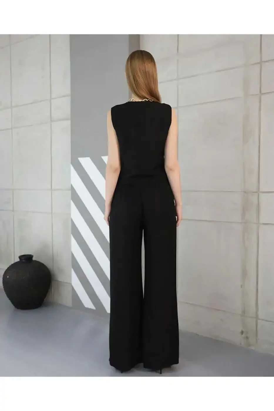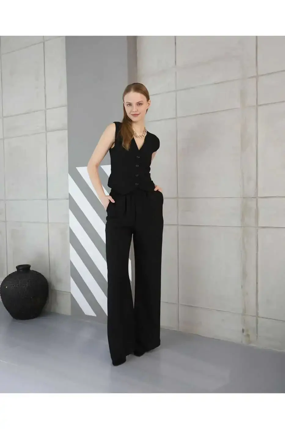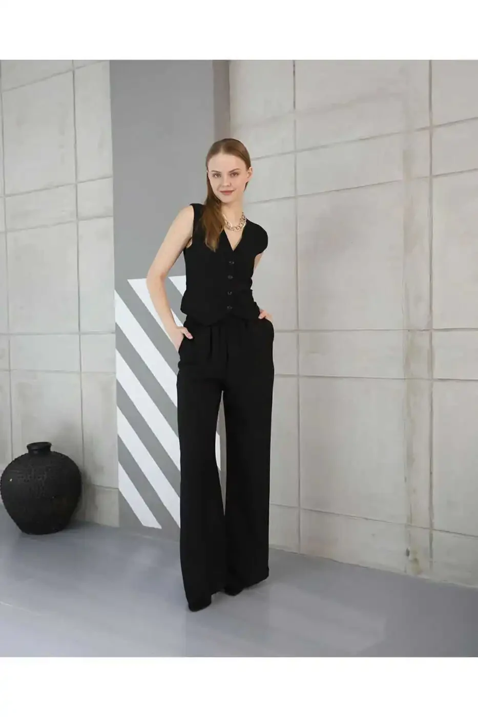 The Sofya Linen Pocket Vest and Trousers Suit offers a timeless style that brings together elegance and comfort during the summer months. Made from natural linen fabric, this suit stands out with its breathability and comfort.